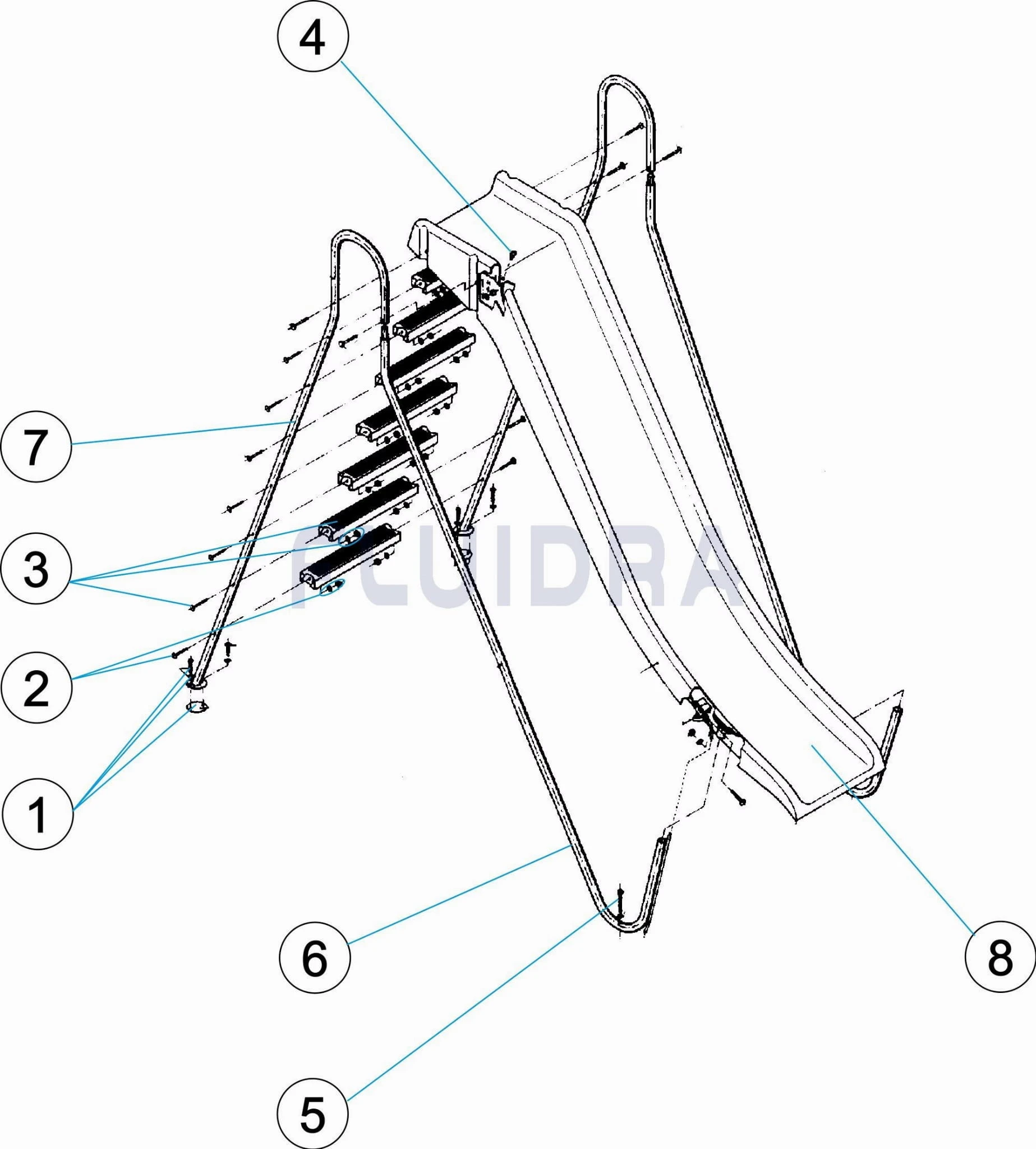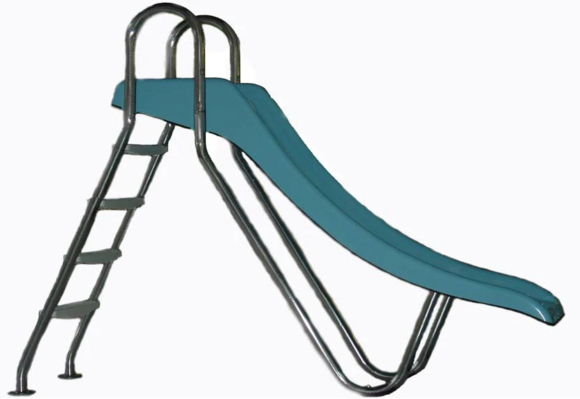 Jasnoniebieski zjeżdżalnia do basenów wykonana z poliestru i włókna szklanego. Plastikowe stopnie wykonane z wytrzymałego tworzywa. Poręcze wykonana ze stali nierdzewnej polerowanej. Wyposażony w przyłącze wody ułatwiające zjeżdżanie.