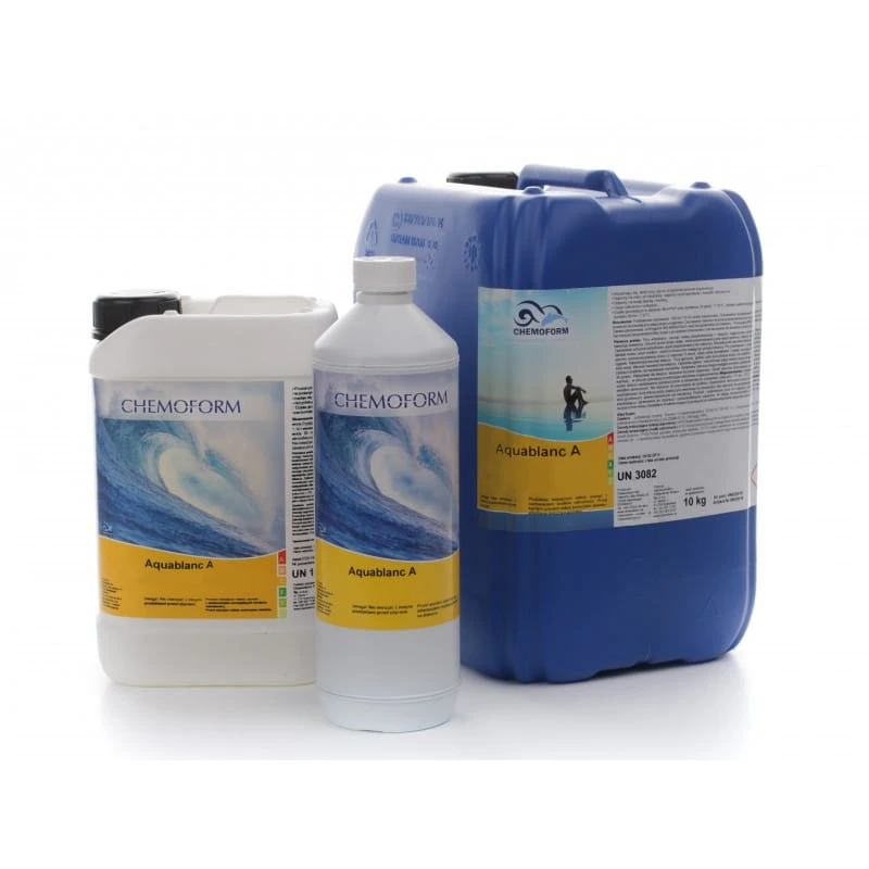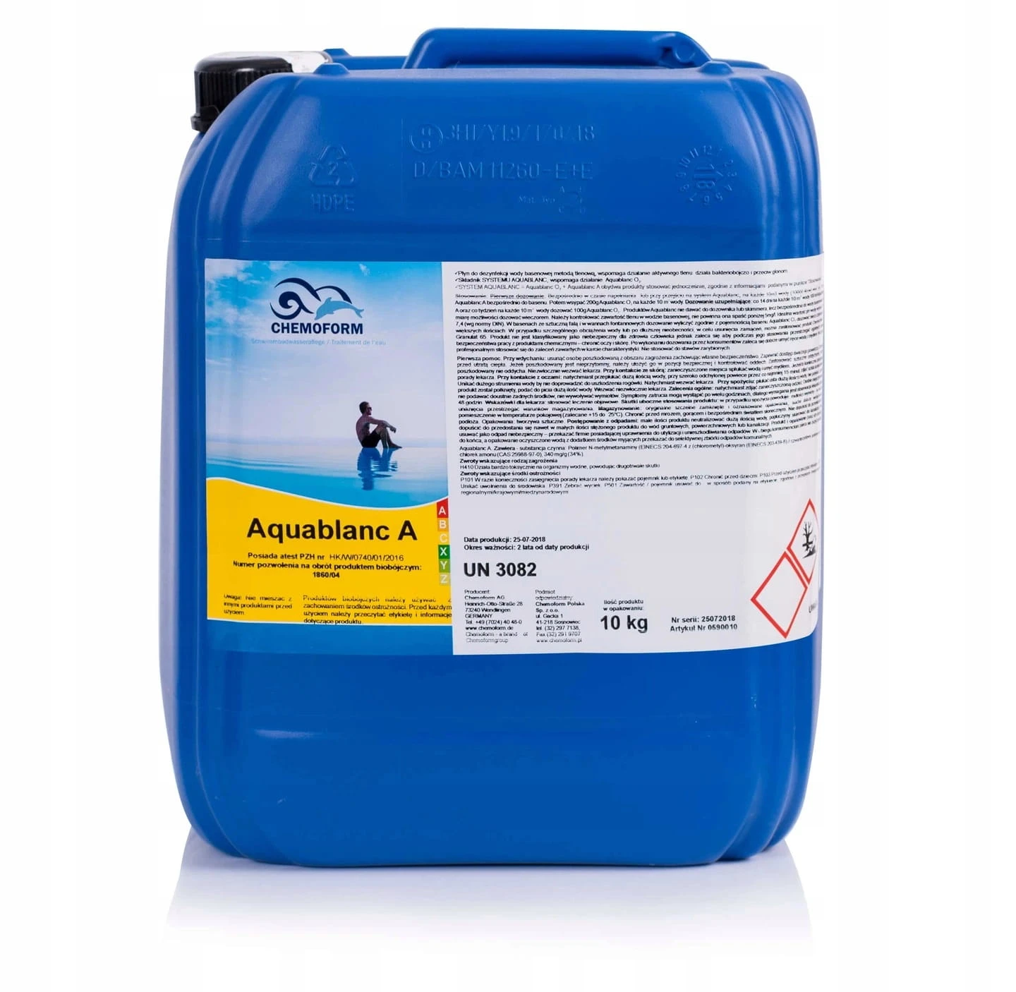 Aquablanc A - oryginalny wzmacniacz działania aktywnego tlenu do bezchlorowej dezynfekcji wody basenowej, zalecany przy stosowaniu automatycznego dozowania tlenu, producent Chemoform Niemcy.