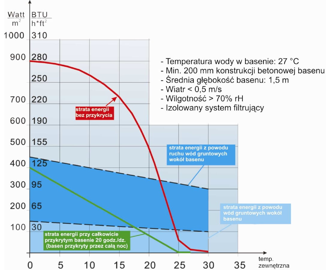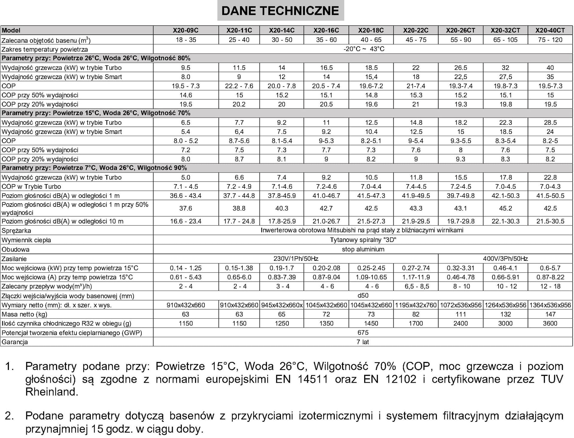 Parametry podane przy: Powietrze 15°C, Woda 26°C, Wilgotność 70% (COP, moc grzewcza i poziom głośności) są zgodne z normami europejskimi EN 14511 oraz EN 12102 i certyfikowane przez TUV Rheinland. Podane parametry dotyczą basenów z przykryciami izotermicznymi i systemem filtracyjnym działającym przynajmniej 15 godz. w ciągu doby.
