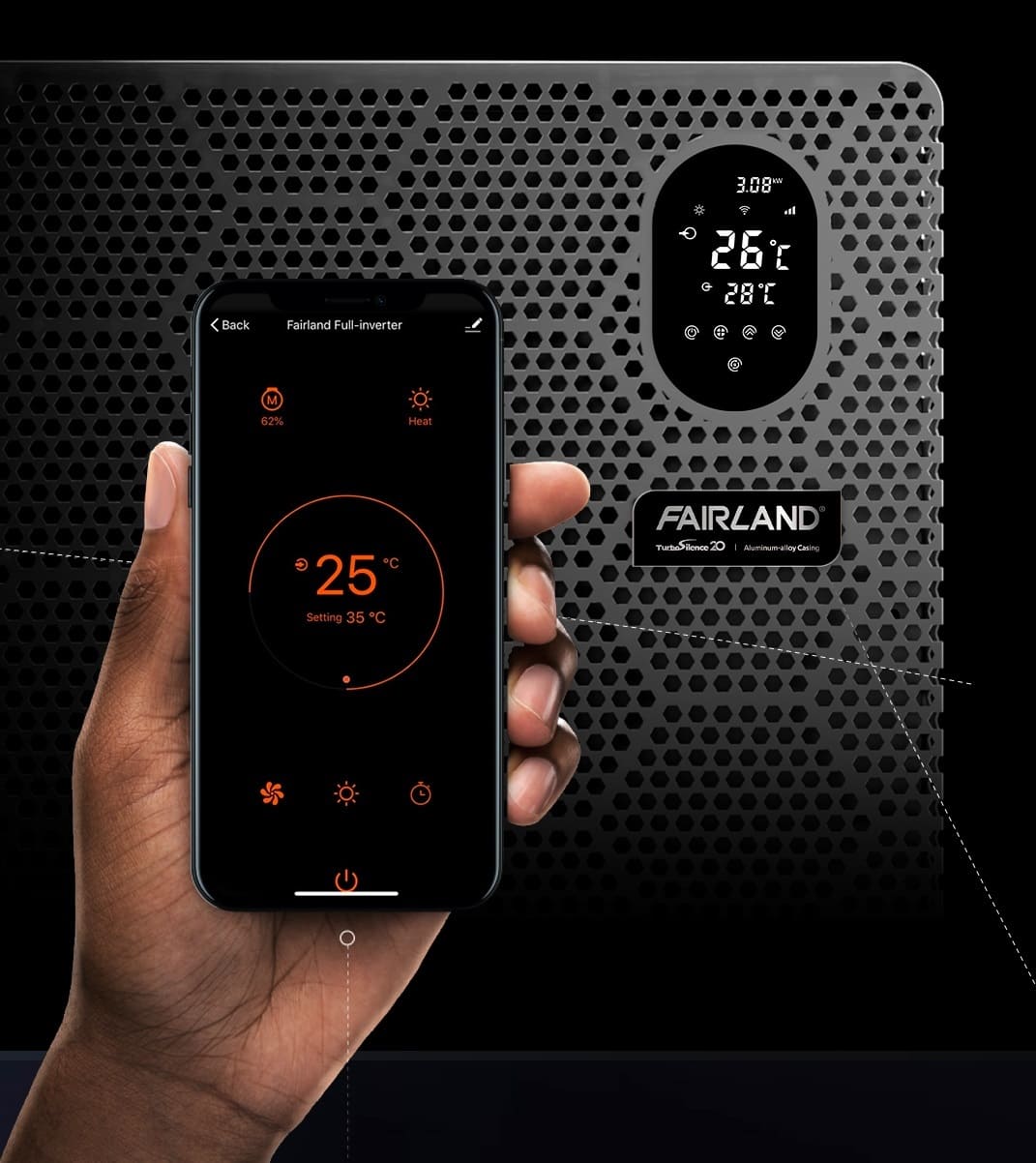 TurboSilence Full-inverter jest zoptymalizowany w oparciu o oryginalną technologię Full-inverter firmy Fairland. Samodzielnie opracowany system sterowania doskonale równoważy proces pracy sprężarki inwerterowej i trójwymiarowej wymiany ciepła (3D). Unikalna technologia inteligentnie optymalizuje natężenie przepływu gazu, aby zmaksymalizować wydajność COP. System sterowania TurboSilence Full-lnverter dostosowuje się do precyzyjnych rozwiązań zużycia energii, współczynnik COP do 20, średni COP>lS. Nawet w niskiej temperaturze można automatycznie, w inteligentny sposób sterować pompą ciepła tak, aby wytwarzała darmową moc cieplną do ogrzewania wody basenowej w zależności od potrzeb użytkownika. Podczas utrzymywania pożądanej temperatury wody, sprężarka i wentylator pracują z bardzo niską prędkością (średnio 30% wydajności grzewczej), co redukuje poziom hałasu do około 36,6 dB(A) w odległości 1 m i do 20 razy zmniejsza poziom zużycia energii.