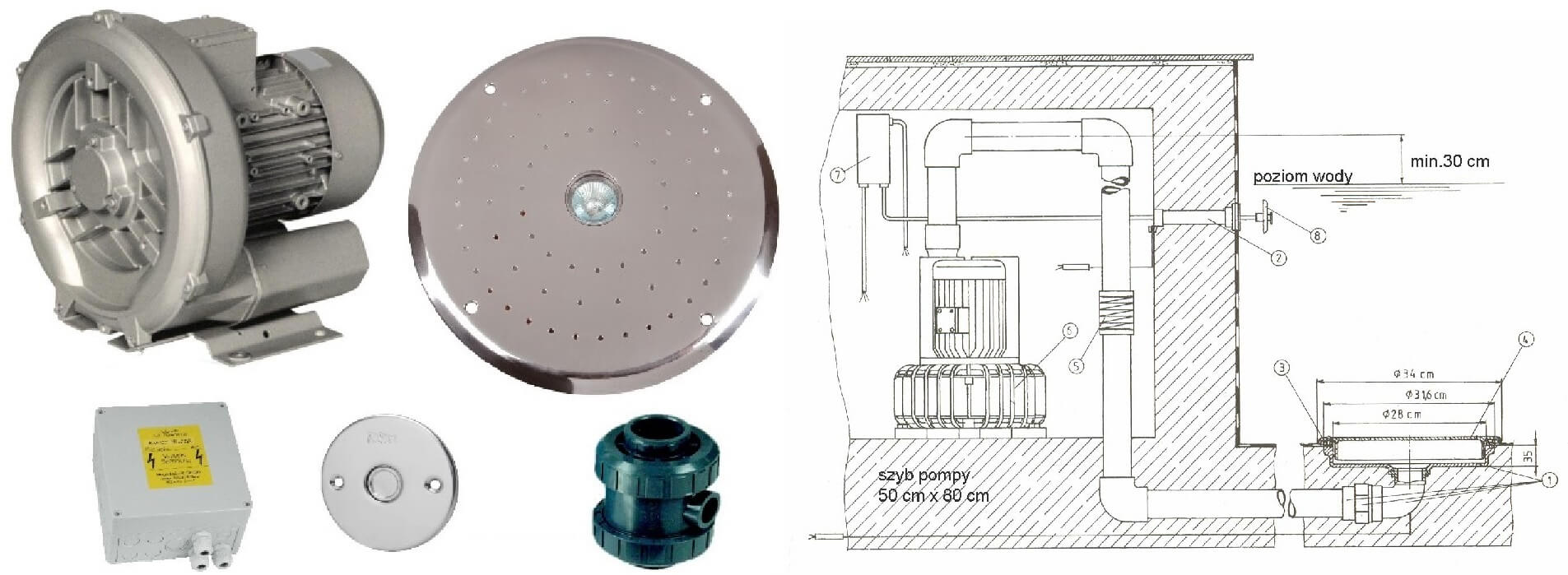 Ten masaż kompletny składa się z: część 1 + część 2. Dla ułatwienia montażu w dnie/murach, podzielono komplety na części 1 i 2, gdyż sam zestaw montażowy zazwyczaj jest potrzebny już na początku budowy basenu, przy wylewaniu ścian.