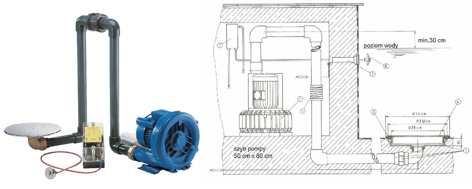 Uwaga: rurociągi tego masażu muszą być wyprowadzone na krótki odcinek PONAD lustro wody, aby zapobiec przypadkowemu zapowietrzeniu układu.