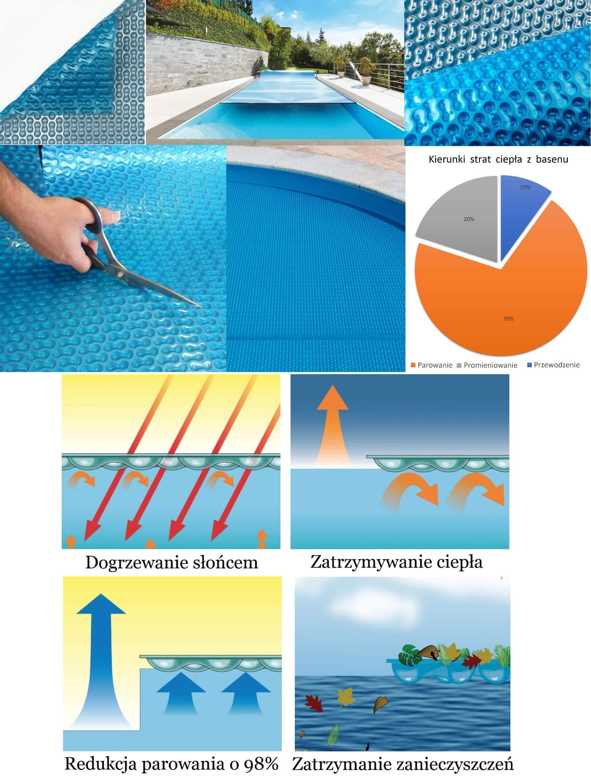 - aby nie marnować wyprodukowanego ciepła, oraz ograniczyć nawiewanie kurzu i parowanie wody, zdecydowanie warto przykrywać basen specjalną folią termiczną, odporną na chlor i UV. Proste, mechaniczne zwijarki do folii wyraźnie zwiększają wygodę codziennego przykrywania i odkrywania basenu. Folię docina się własnoręcznie do wymiarów niecki, ma być metr dłuższa niż lustro wodu, aby równo się zwijała i nawijała. Stosujemy prywatnie zasadę: "ostatnia osoba wychodząca z wody zakrywa basen, kto zapomni - sprząta". Działa.