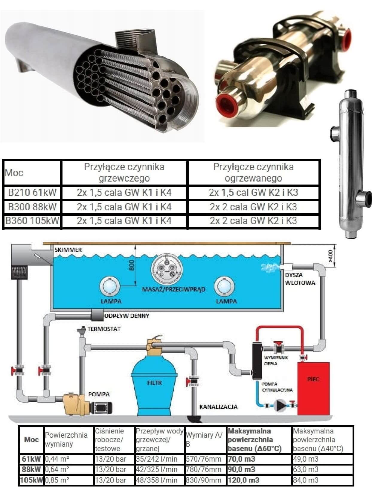 - basenowy wymiennik ciepła z kotła/pieca jest ekonomiczny i wydajny gdy jest dobrze dobrany do mocy i przepływu źródła ciepła. W niektórych sytuacjach wymaga podtrzymywania pieca/kotła w stosunkowo ciepłe dni, i\lub odcinania ogrzewania reszty domu. PRZED ZAKUPEM WYMAGA DOBRANIA MOCY DO KOTŁA/PIECA PRZEZ INSTALATORA, ponieważ montaż od strony źródła ciepła wymaga przebudowy tamtej instalacji, od strony basenu zalecany jest montaż na bypasie w celu regulacji tempa przepływu