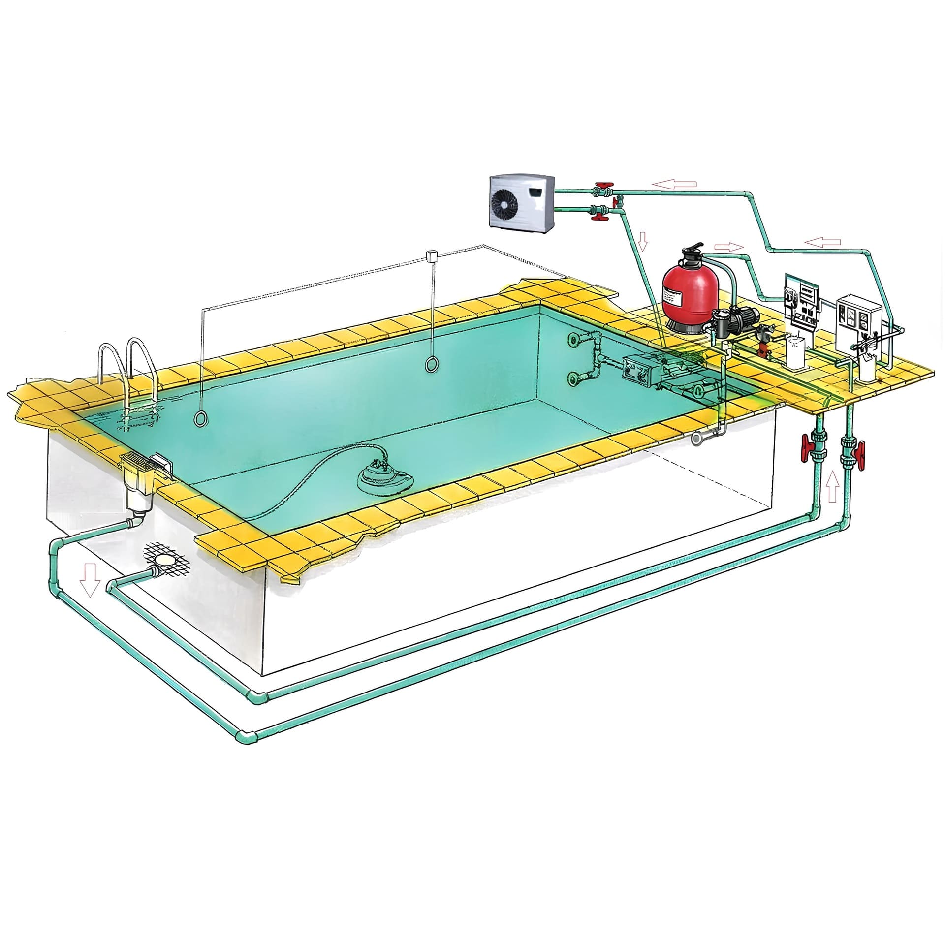 - basenowa pompa ciepła jest dość droga w zakupie, ale bardzo ekonomiczna w użytkowaniu. Basenowe pompy ciepła NIE mają w sobie podgrzewaczy elektrycznych, więc ich efektywność zależy od aktualnej pogody. Przewymiarowanie pompy ciepła, tzn. zakup urządzenia o zawyżonej mocy w stosunku do zalecanej przez producenta objętości basenu NIE przyspieszy tempa podgrzewania. Najlepszą wydajność osiąga się dzięki precyzyjnemu wyregulowaniu tempa przepływu wody bypasem, oraz ustawienie urządzenia w przewiewnym, słonecznym i nieosłoniętym miejscu. Urządzenie może sterować pracą pompy obiegowej.