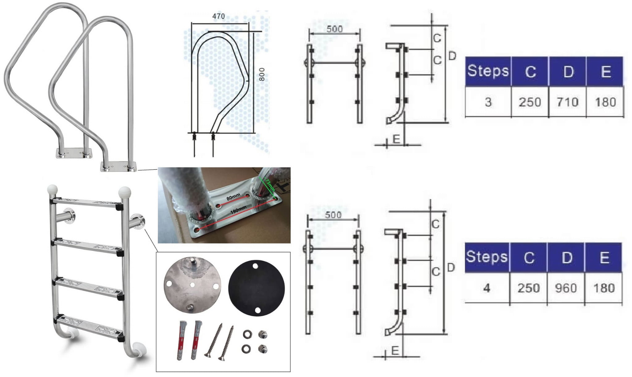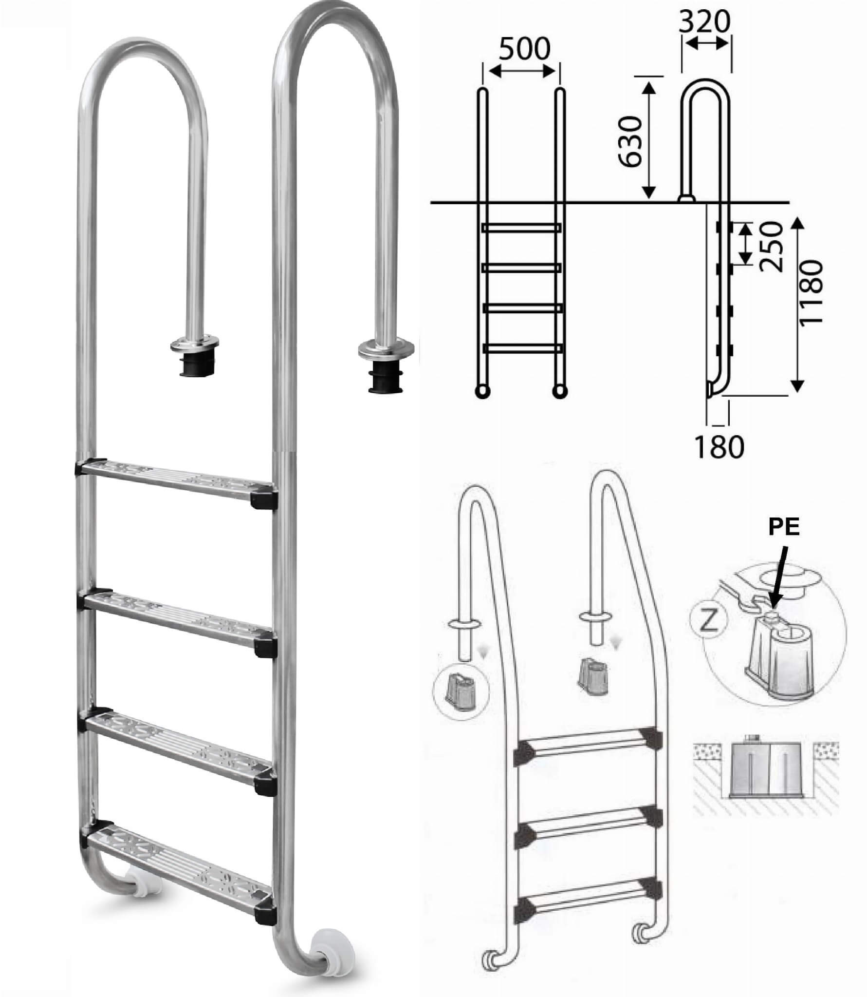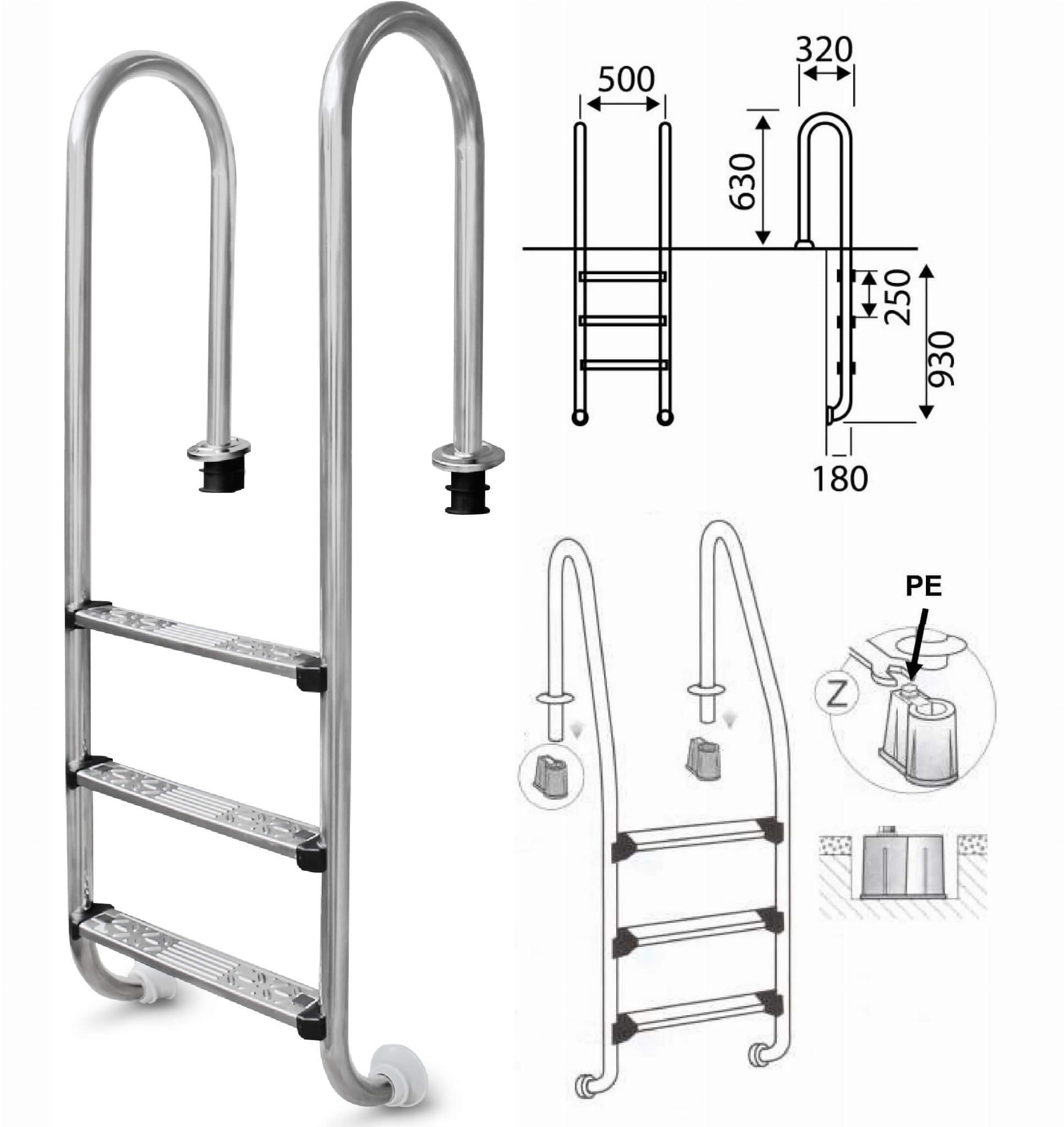 - zalecamy zamiast schodów montaż wygodnych drabinek, z opcjonalnymi szerokimi bezpiecznymi stopniami, analogicznie jak w sanatoriach, ośrodkach wypoczynkowych, hotelach. Elegancka stalowa drabinka z polerowanymi poręczami jest wygodna, demontowalna, bezpieczna i optymalna koszty/efekt.