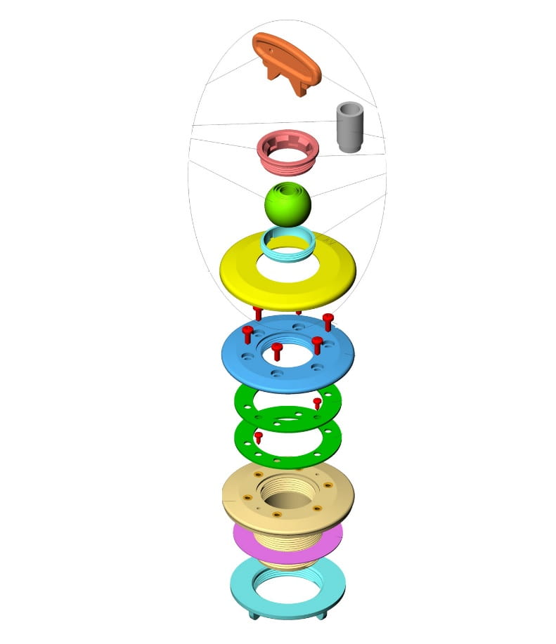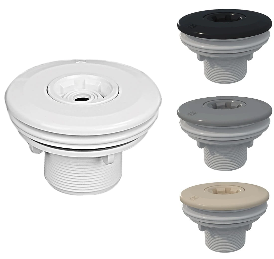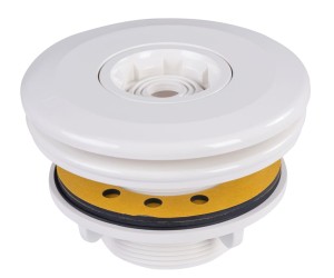 Kompletna dysza EURO wylotowa (napływowa) do basenów wyłożonych folią, z gwintem GZ 2" cale (w środku klejone KW fi 50) i uszczelkami. Dysza pozwala na ustawienie przepływu i kierunku: 3, 5 lub 7 m³/h za pomocą specjalnej kulki na końcówce, którą można wybić do przepływności 5 lub 7. Poza klasycznym białym kolorem, dysza jest dostępna na zamówienie również jako beżowa (kolor RAL1015), jasnoszara (RAL7004) lub elegancka czarna (RAL7016).