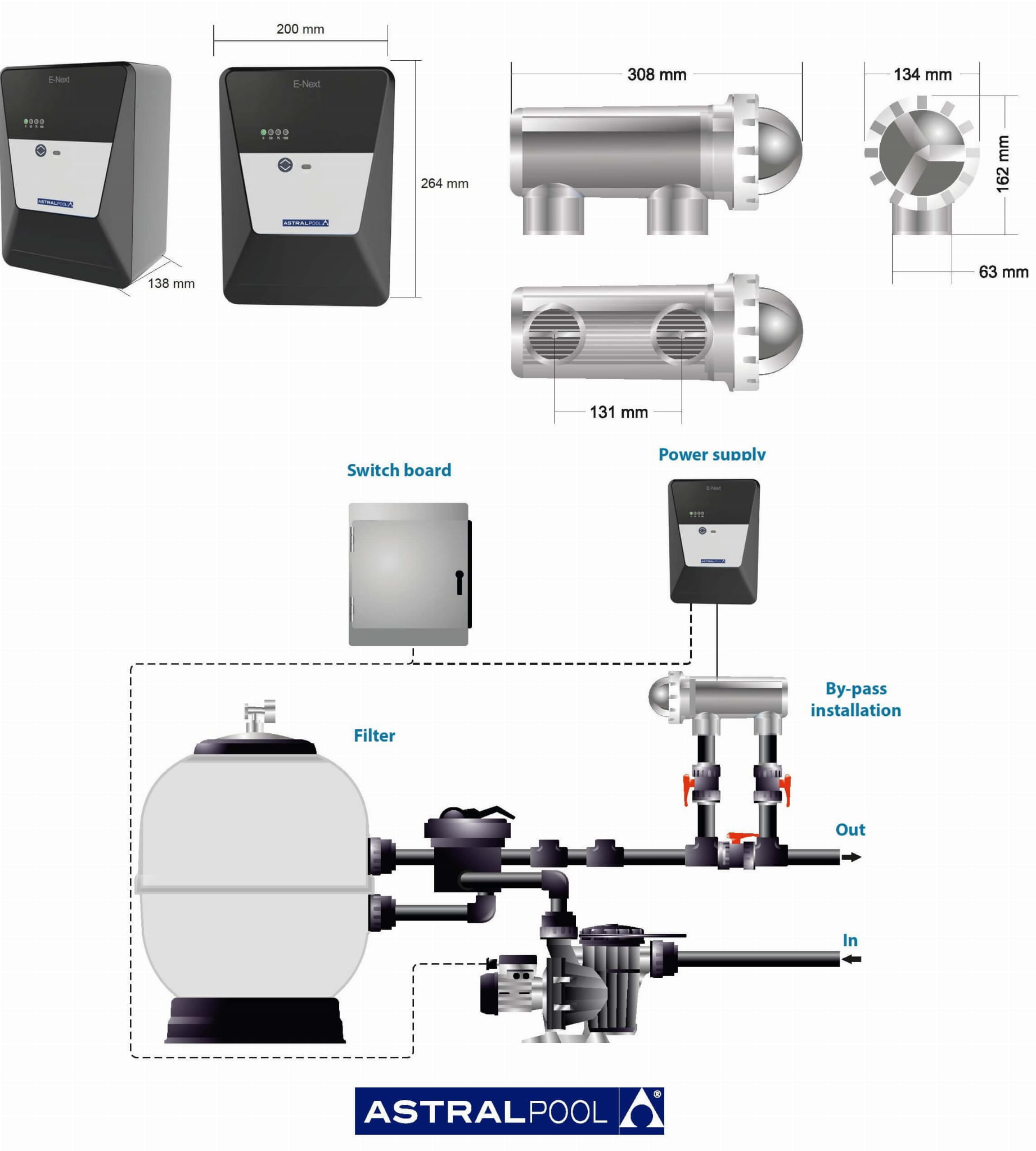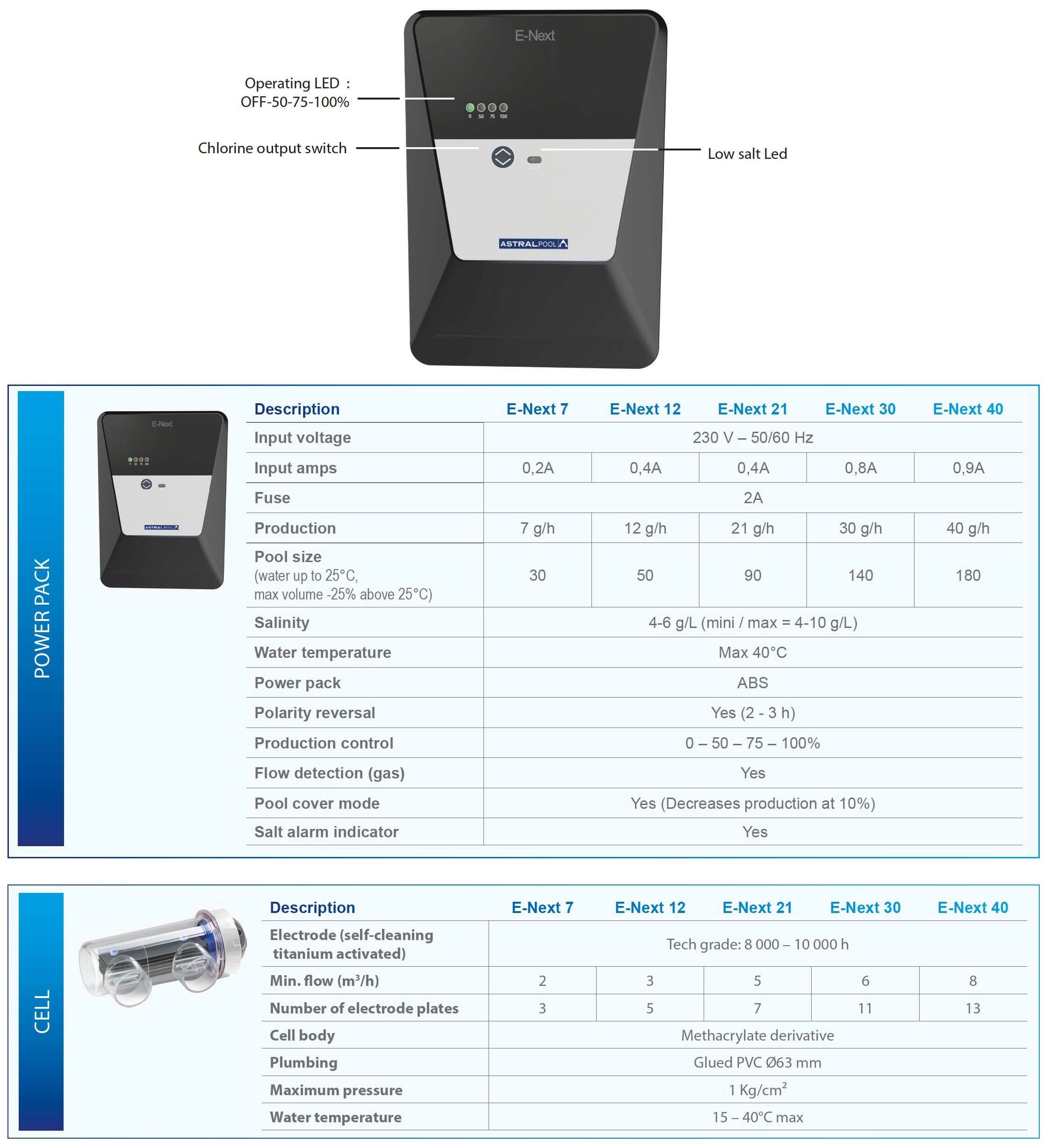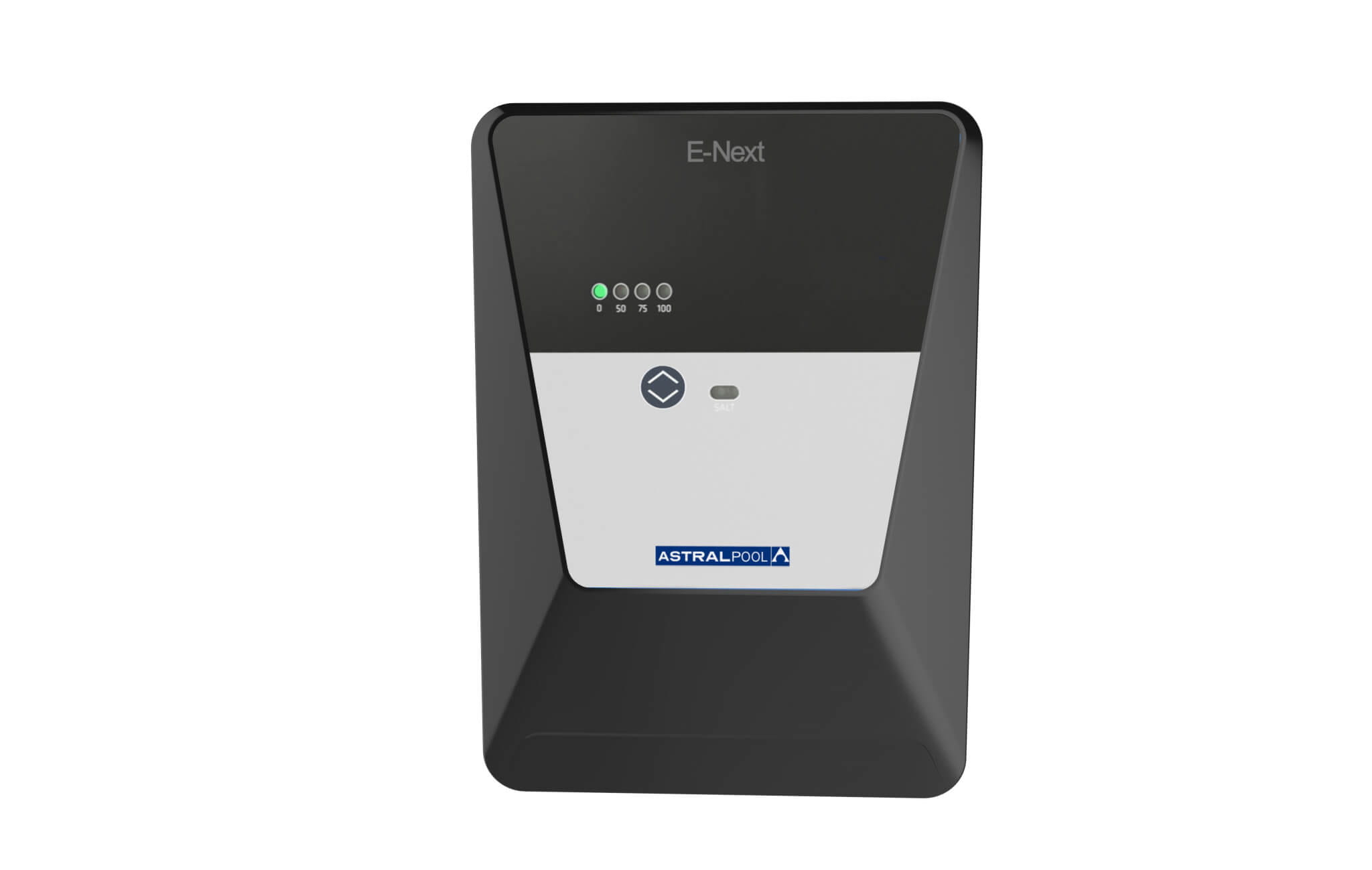 Chlorator solankowy E-Next jest w stanie uzdatniać baseny o pojemności do 180 m³, automatycznie dezynfekuje i obniża produkcję chloru, jeśli basen jest wyposażony w automatyczną pokrywę basenową (dedykowany suchy kontakt). Odwrócenie biegunowości pomoże w czyszczeniu elektrod, a alarm solny ostrzeże użytkownika w przypadku niskiego stężenia soli, aby uniknąć uszkodzenia ogniwa i zabarwienia basenu na zielono.