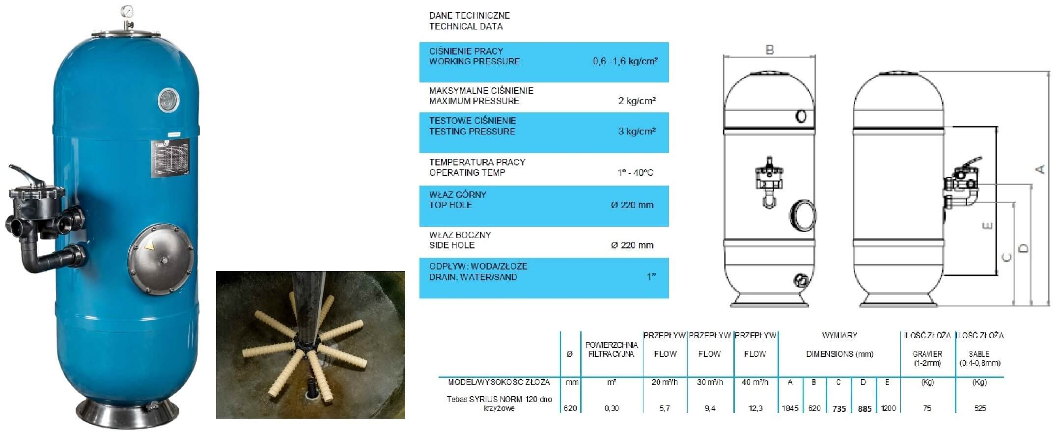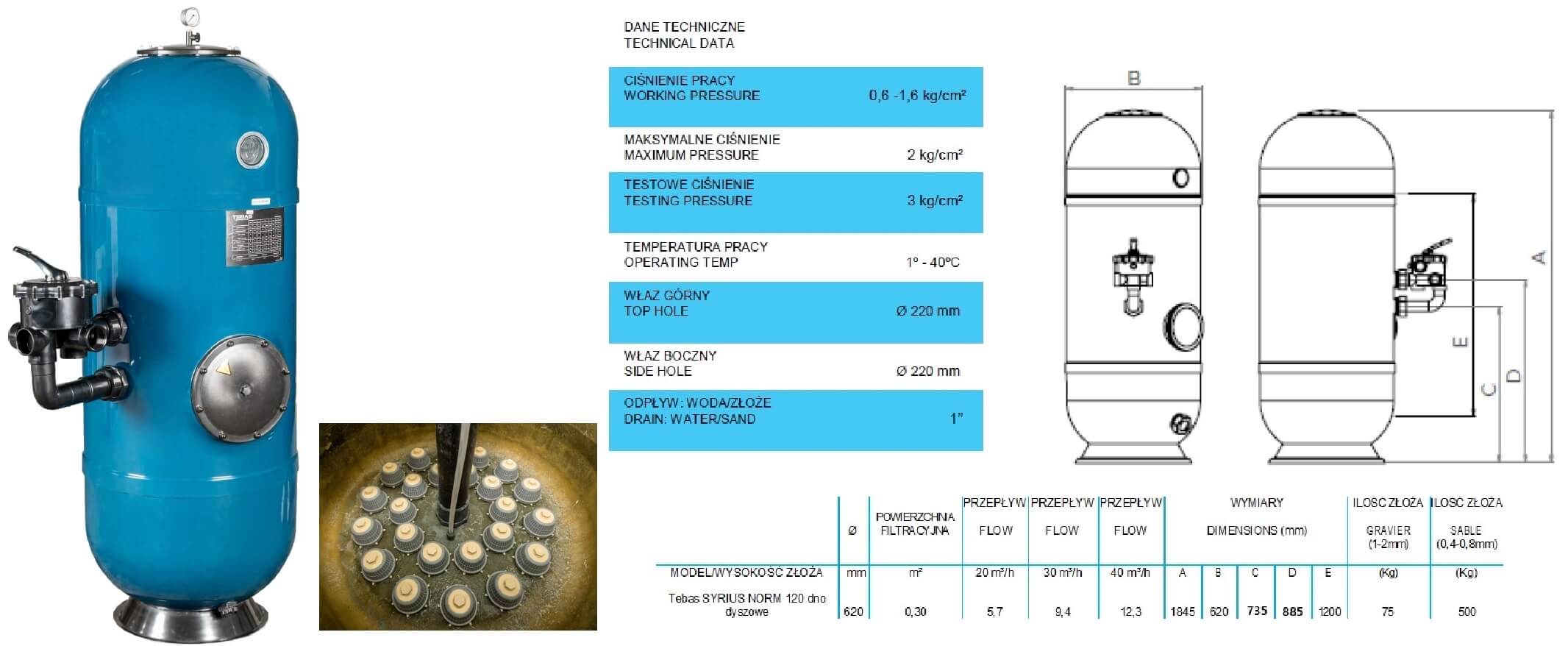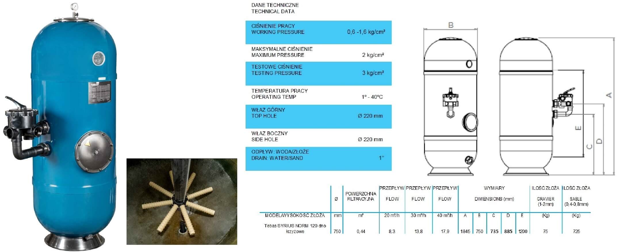 Tebas SYRIUS II Norm 120 to filtr wielowarstwowy, laminowany o wysokich parametrach,wykonany z najlepszych żywic wzmocnionych włóknem szklanym, odpornych na wodę basenową, także słoną. Wysokość filtra 185 cm. Wysokość złoża 120 cm (dno krzyżowe lub dyszowe). Średnice filtrów: 620, 750 i 900 mm. Może być zestawiony z dowolną pompą o dedykowanej wydajności.