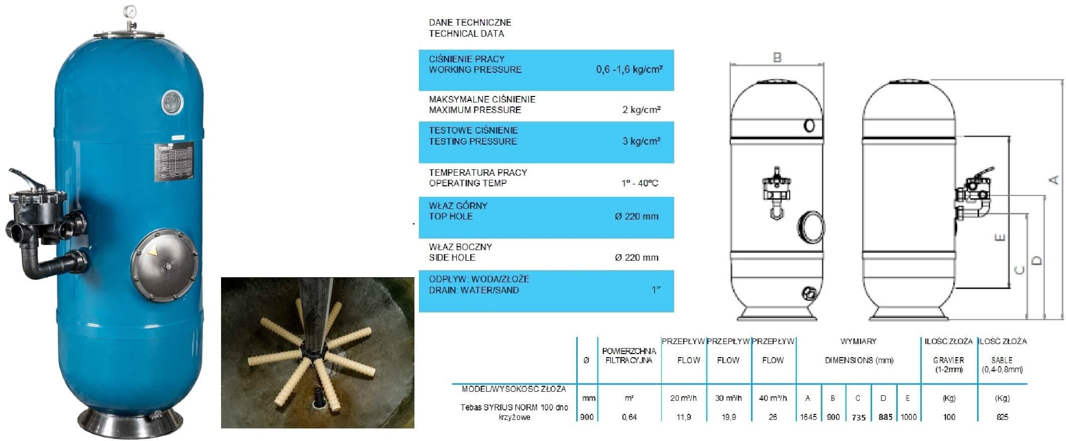 Tebas SYRIUS II Norm 100 to filtr wielowarstwowy, laminowany o wysokich parametrach,wykonany z najlepszych żywic, wzmocnionych włóknem szklanym, odpornych na wodę basenową, także słoną. Wysokość filtra 170 cm. Wysokość złoża 100 cm (dno krzyżowe). Średnice filtrów: 620, 750 i 900 mm. Może być zestawiony z dowolną pompą o dedykowanej wydajności.