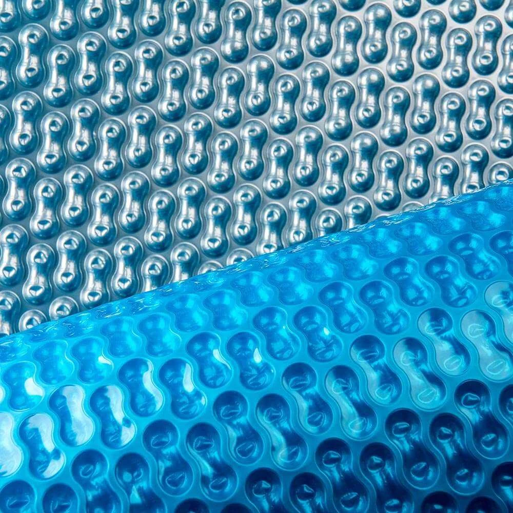 Oryginalna pokrywa solarna GeoBubble jasno niebieska (srebrną nieprzezroczysta warstwa z bąbelkami od strony wody, niebieską przezroczysta warstwa z wierzchu, grubość 400 mikronów - bąbelki nie do przebicia, wyprodukowana z najwyższej jakości polietylenu LDPE, cena za 1 metr bieżący wybranej szerokości. Sprzedawana jest w pełnych metrach bieżących na dowolną długość, szczególnie zalecana do basenów zewnętrznych (na powietrzu).