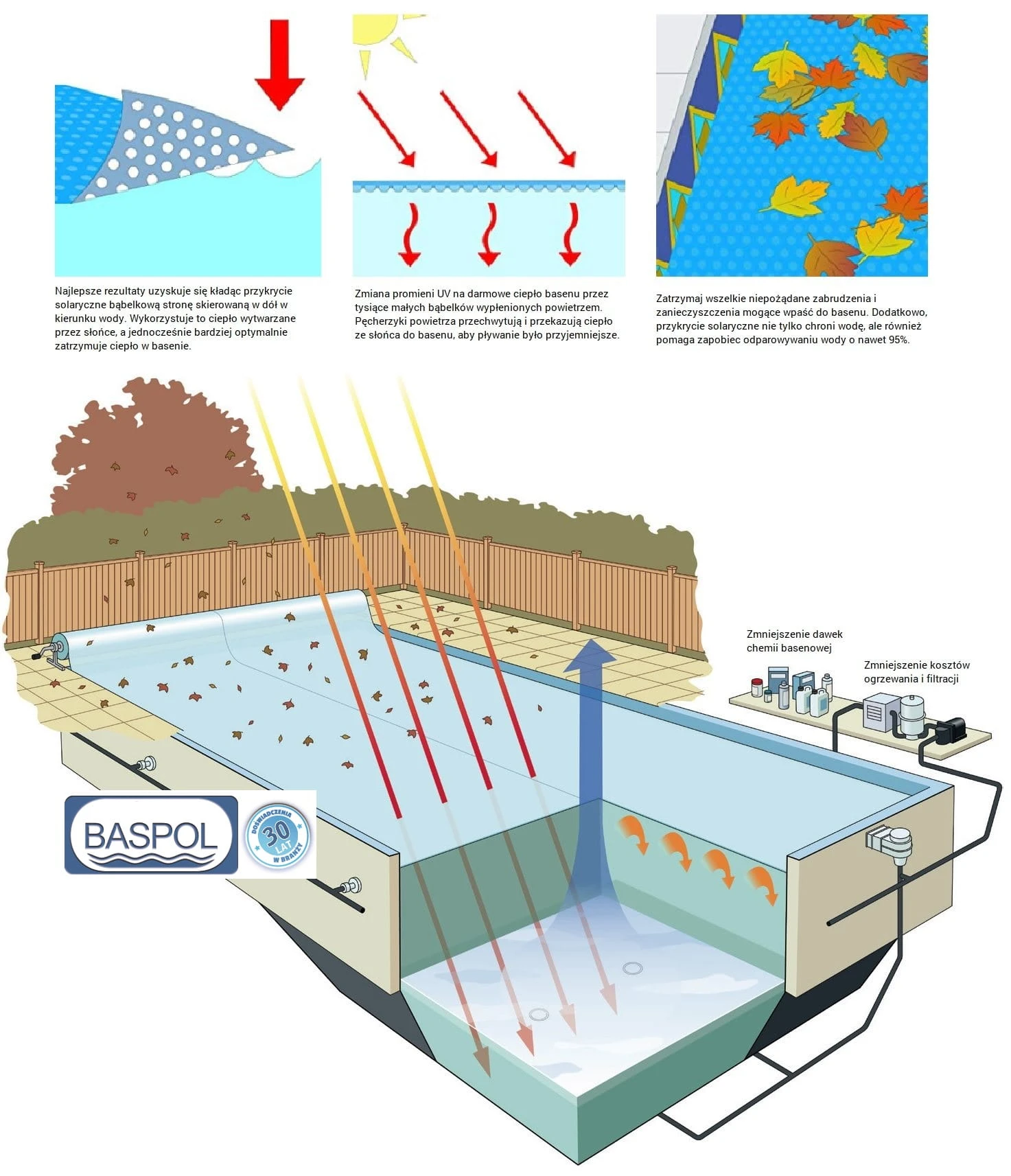 Plandeka na basen, ze specjalnej folii pęcherzykowej, jest jednym z najpraktyczniejszych dodatków do każdego basenu - betonowego, stelażowego, rozporowego Bestway/Intex. Rozwiązuje najważniejsze problemy basenu zewnętrznego: dogrzewa wodę, spowalnia parowanie i straty ciepła, hamuje rozrost glonów, oraz blokuje nawiewanie zanieczyszczeń.