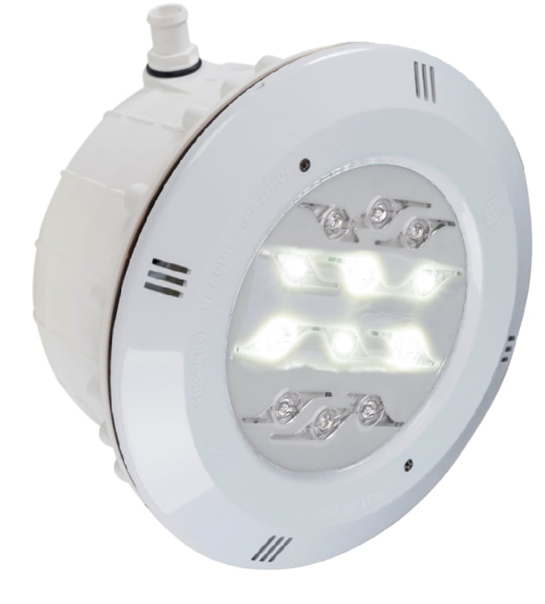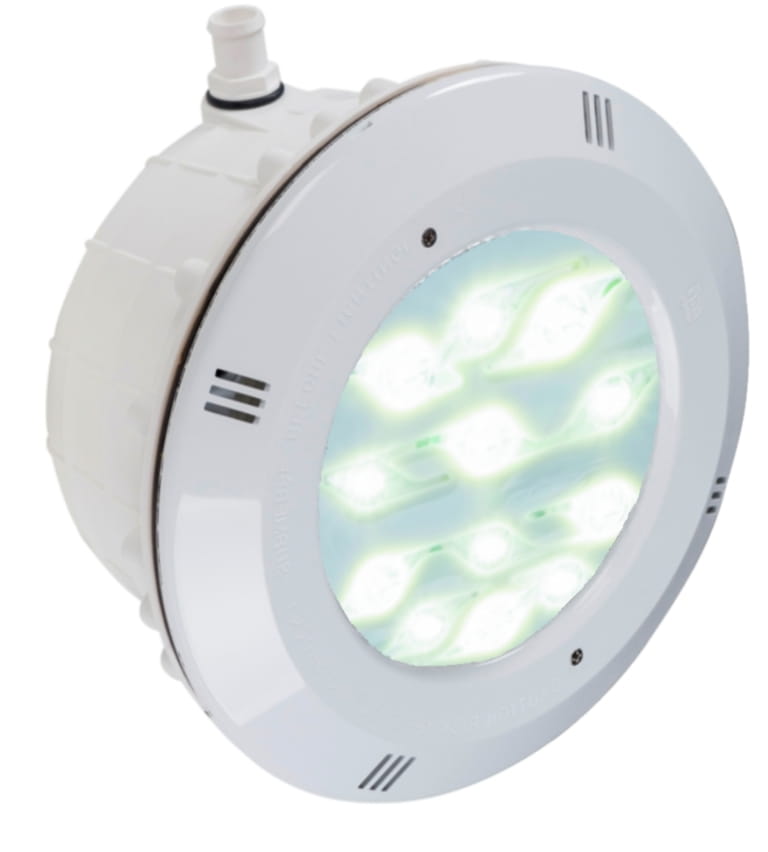 Lampa basenowa z żarówką LED w ośmiu różnych wariantach. Podświetlanie wody w basenie żarówkami led daje niesamowity efekt wizualny w porównaniu z tradycyjnymi żarówkami 300 W. Lampy diodowe wymagają zasilania AC 12V o mocy o 10% większej od łącznej mocy pobieranej przez żarówkę/żarówki, dodatkowej uszczelki w przypadku basenu foliowego, i podłączenia kablem dwużyłowym. Lampy posiadają żarówki PAR56.