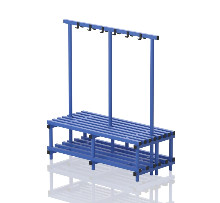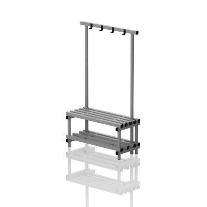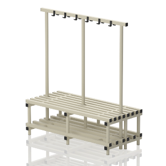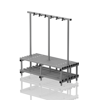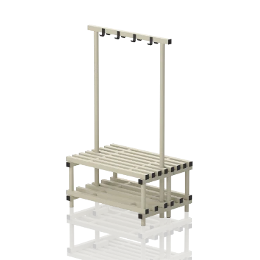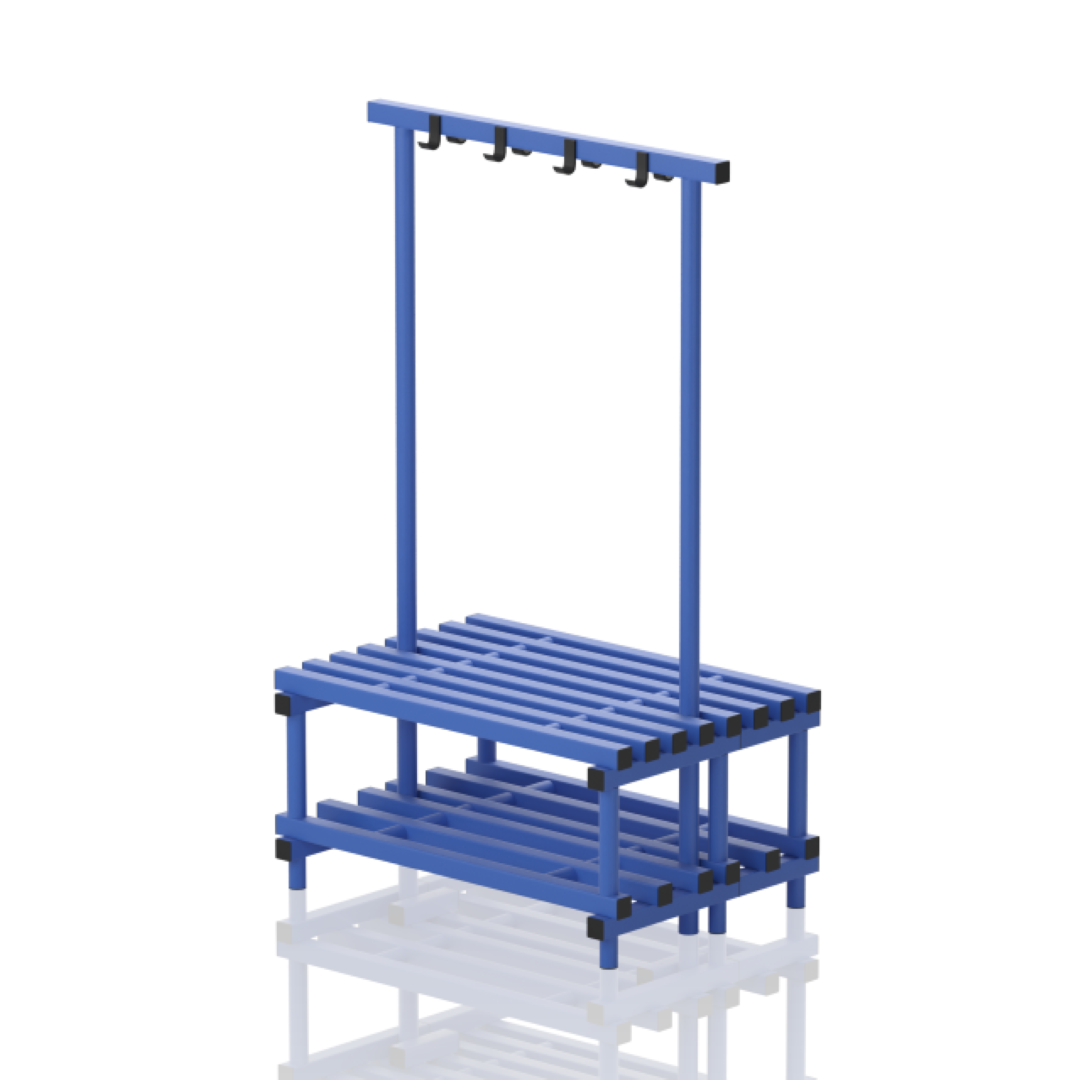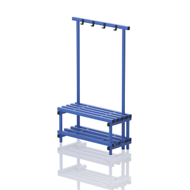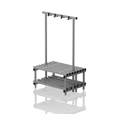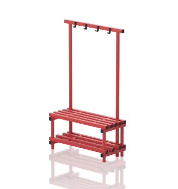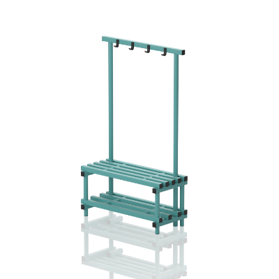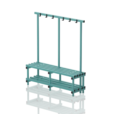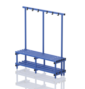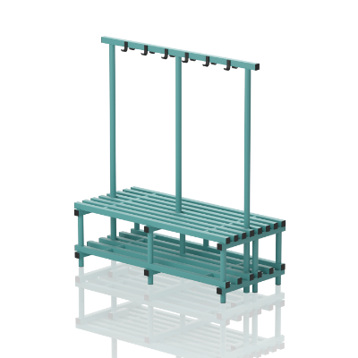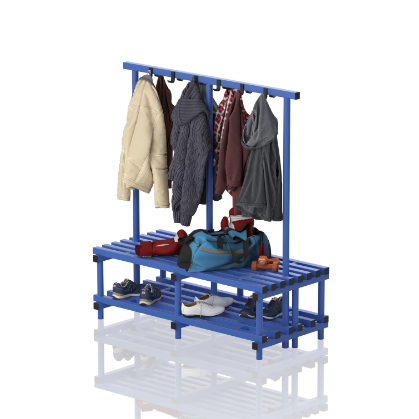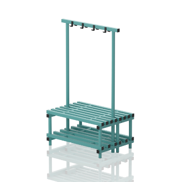 Ławki basenowe z tworzywa sztucznego z dolną półką i wieszakiem - jednostronne i dwustronne. Ławki dostępne są też w wersji JUNIOR, z wieszakiem obniżonym z 170 cm do 140 cm - idealne dla szatni w przedszkolu i szkole podstawowej.