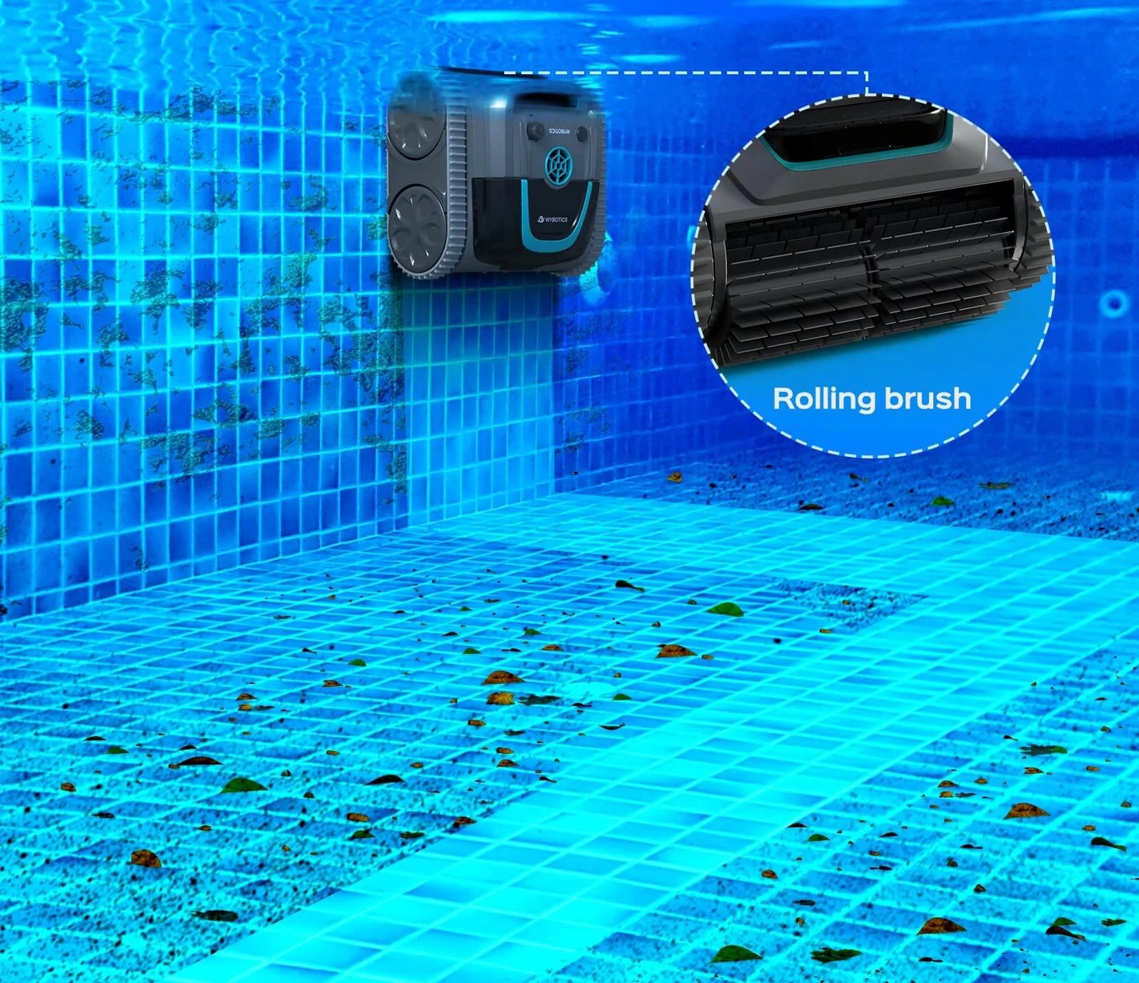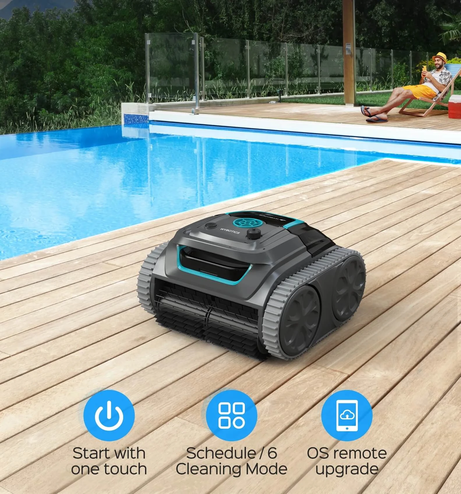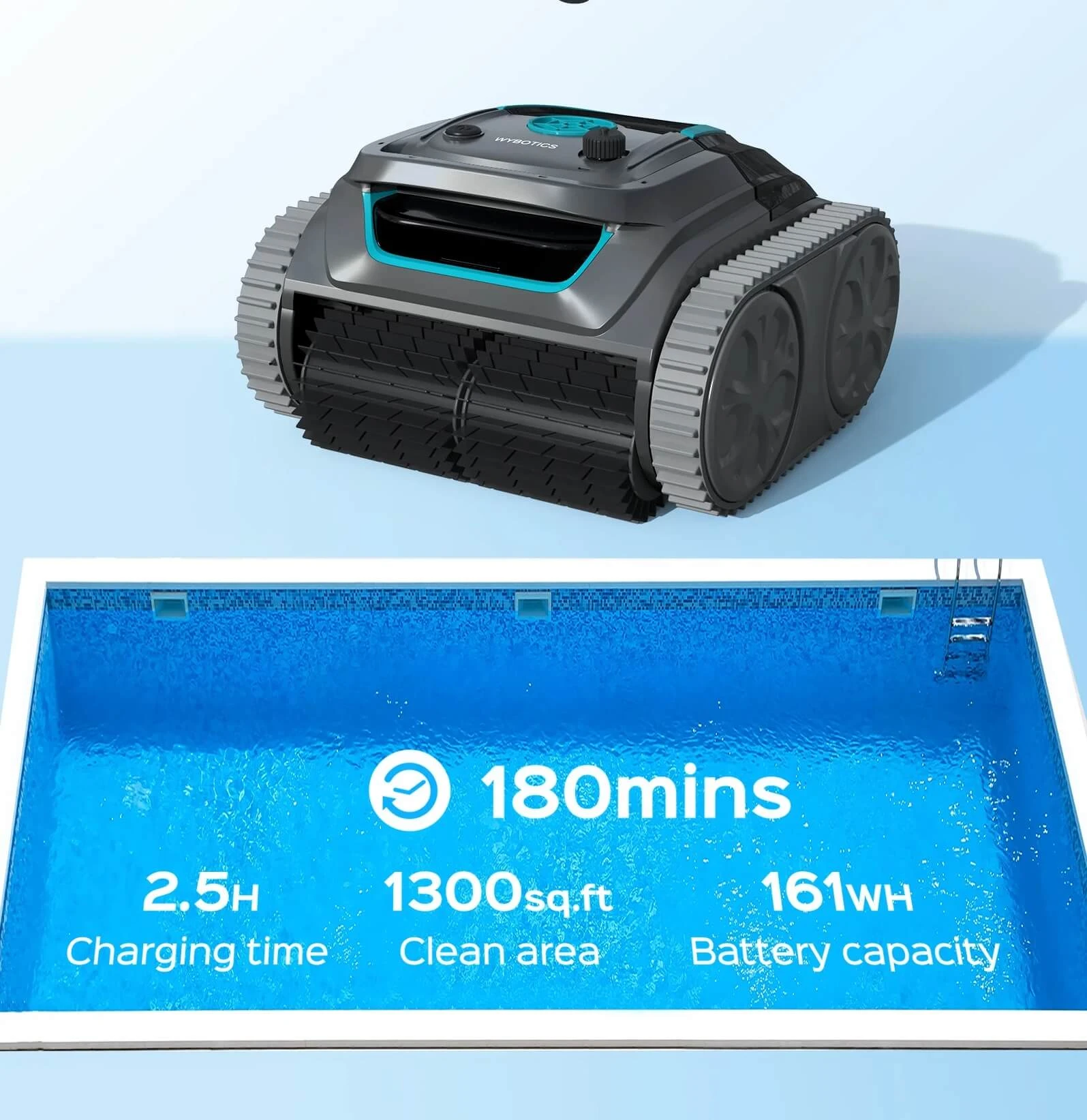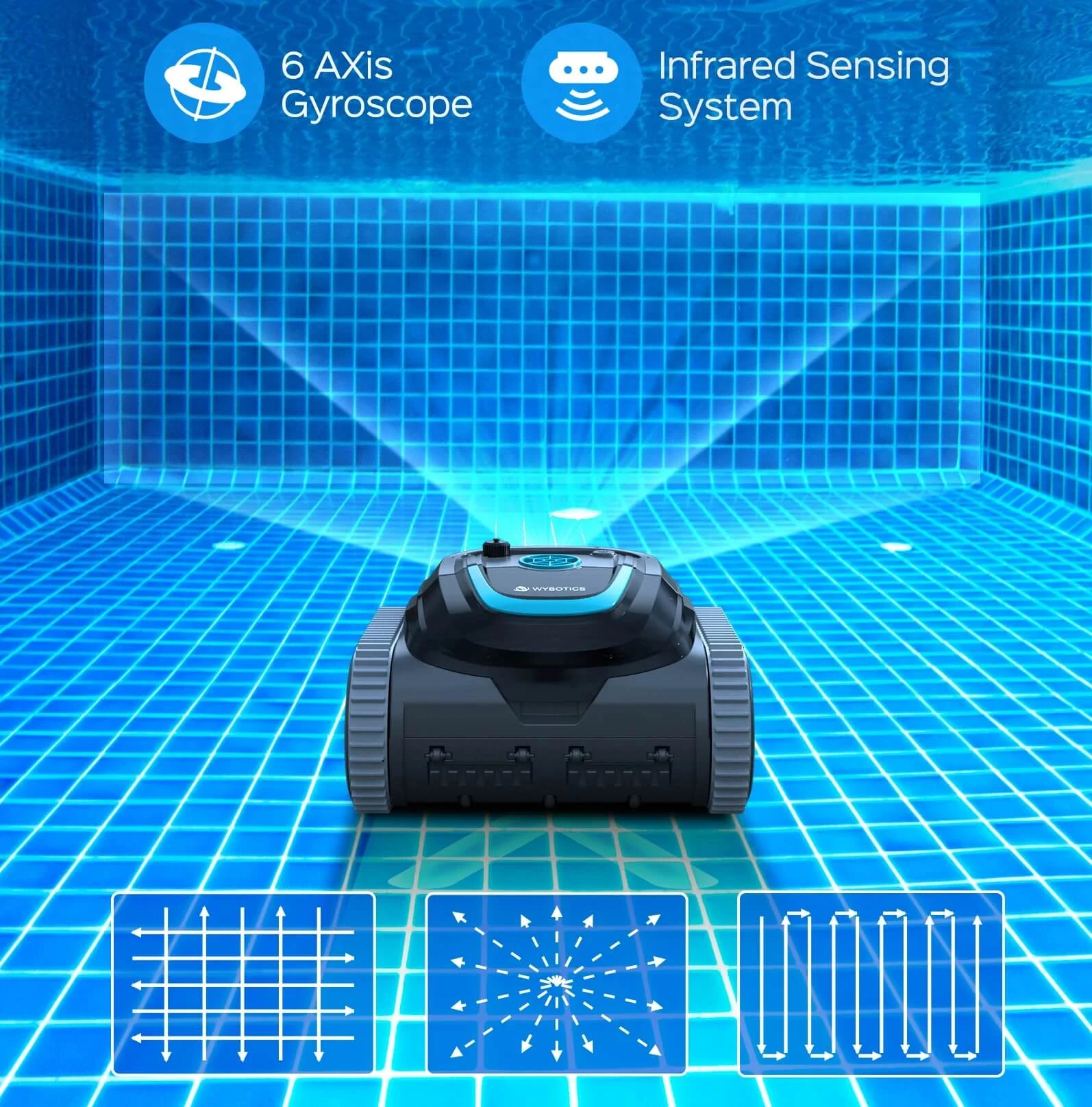 Bezprzewodowy robot basenowy z aplikacją: WYBOT jest pierwszą marką, która opracowała bezprzewodowego robota basenowego z aplikacją, oferującą różne tryby i ścieżki czyszczenia. Do basenów o powierzchni do 120 m² o dowolnym kształcie i z dowolnym pokryciem (folia, beton, laminat). Czyści dno, ściany i linię wodną. Pokonuje przeszkody do 3,5cm wysokości.