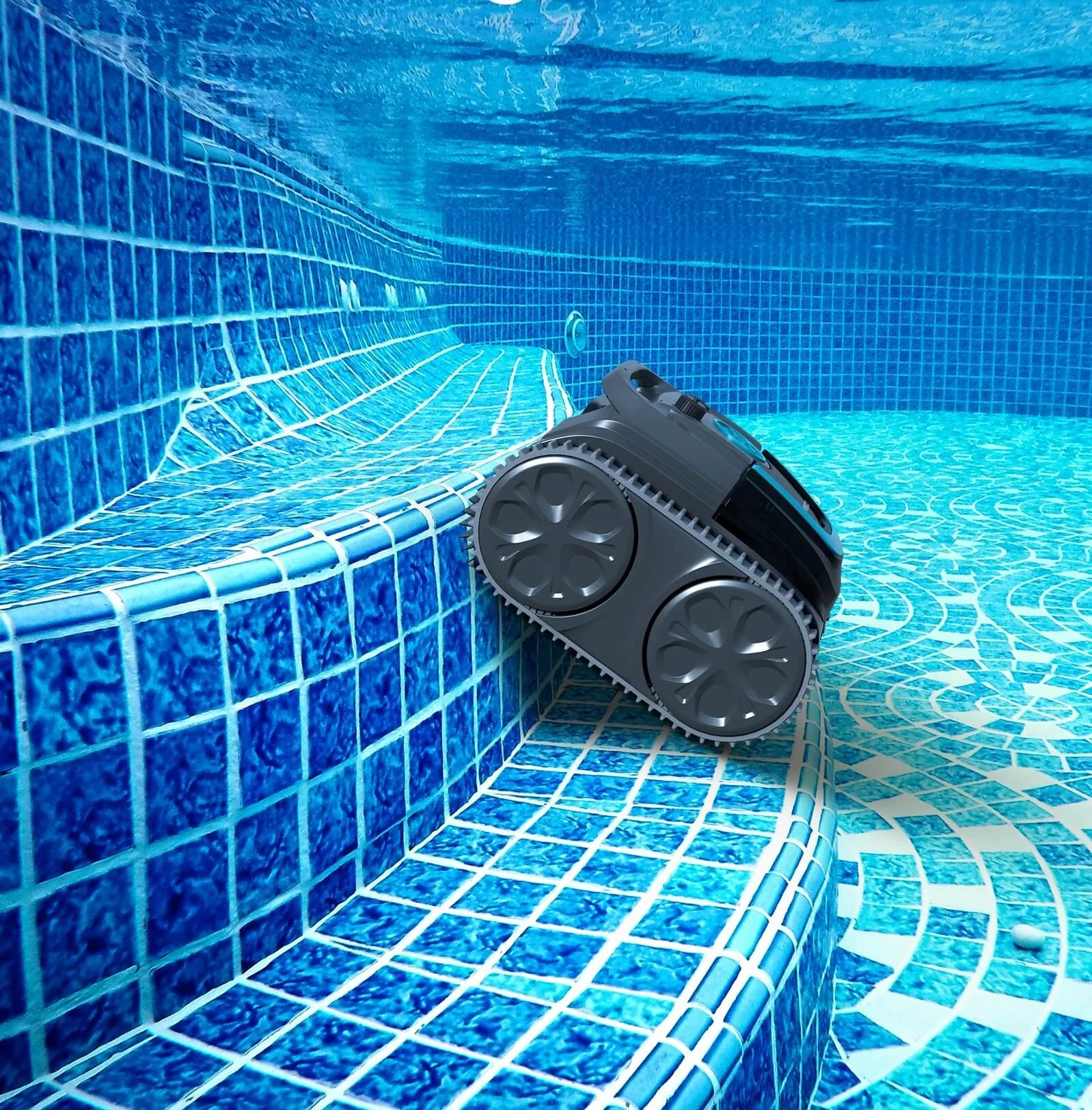 - Wyposażony w trzy mocne silniki i dwie wytrzymałe szczotki, bez wysiłku wychwytuje brud, liście i zanieczyszczenia. Specjalna szczelna konstrukcja zapewnia wydajną pracę i zapobiega przedostawaniu się brudu lub zanieczyszczeń z powrotem do wody basenowej, pozostawiając basen lśniąco czysty.