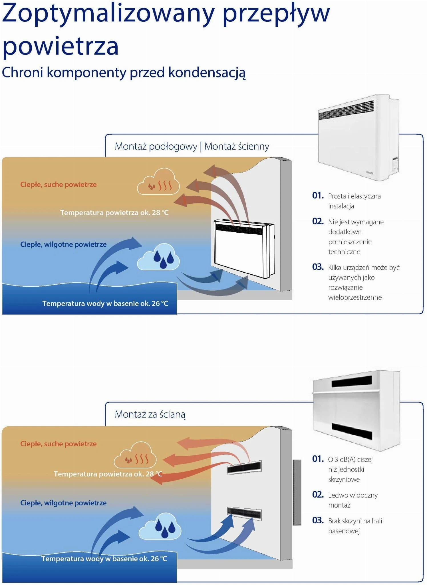 Osuszacze powietrza do profesjonalnego użytku w krytych basenach, strefach spa i fitness, wilgotnych pomieszczeniach i pomieszczeniach o podwyższonej wilgotności lub wymagających ochrony antykorozyjnej. Bardzo ciche osuszacze ze zintegrowanym odzyskiem ciepła charakteryzują się ekonomiczną pracą przy minimalnym zużyciu energii i bardzo elastycznym zastosowaniem. Można wybrać między instalacją ścienną, podłogową lub tylną z elektrycznymi lub pompowymi podgrzewaczami ciepłej wody. Dzięki modułowej konstrukcji możliwa jest również modernizacja.
