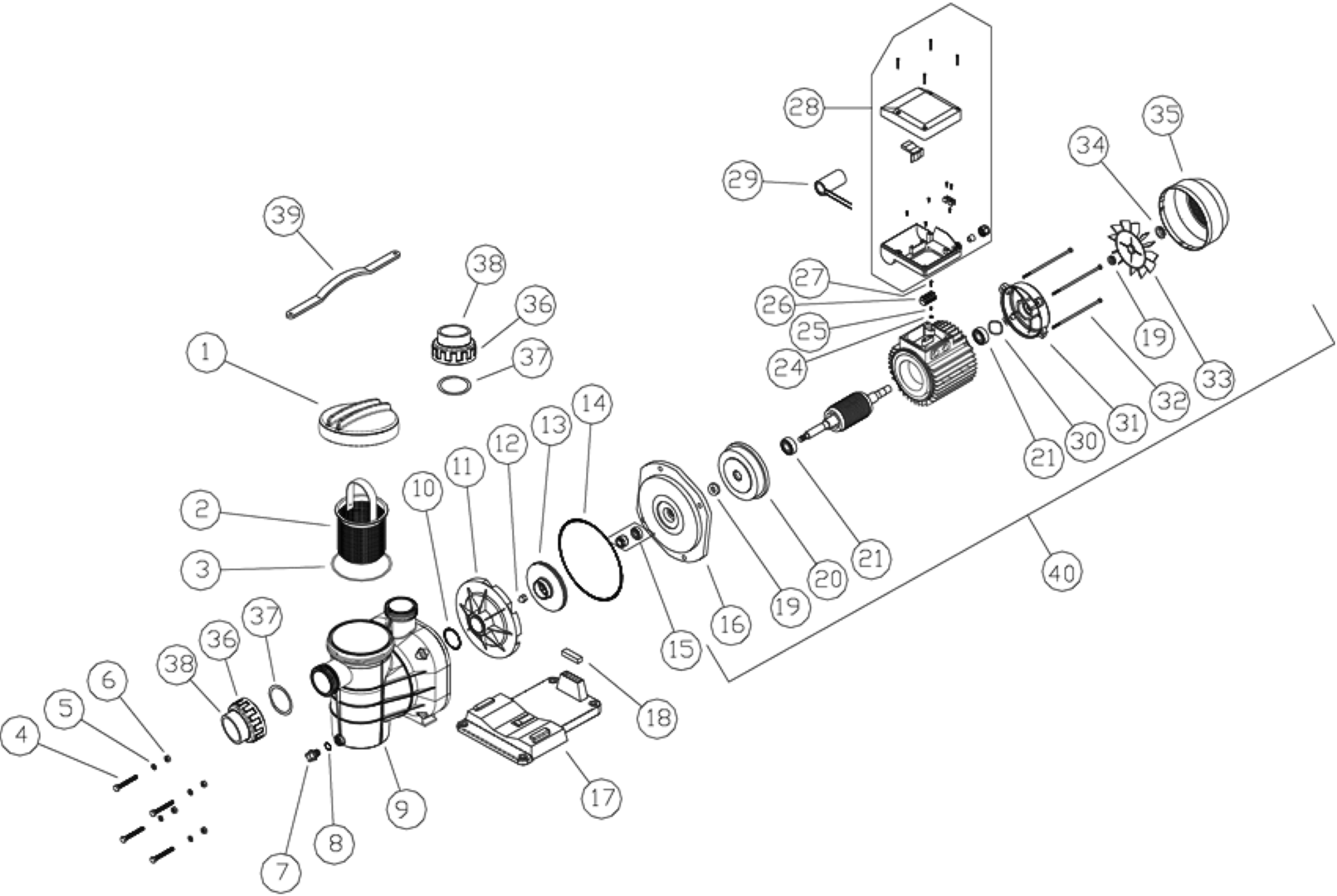 - Korpus pompy wykonany z polipropylenu wzmocnionego włóknem szklanym, odporny na produkty chemiczne w basenie, gwarantuje długą żywotność.