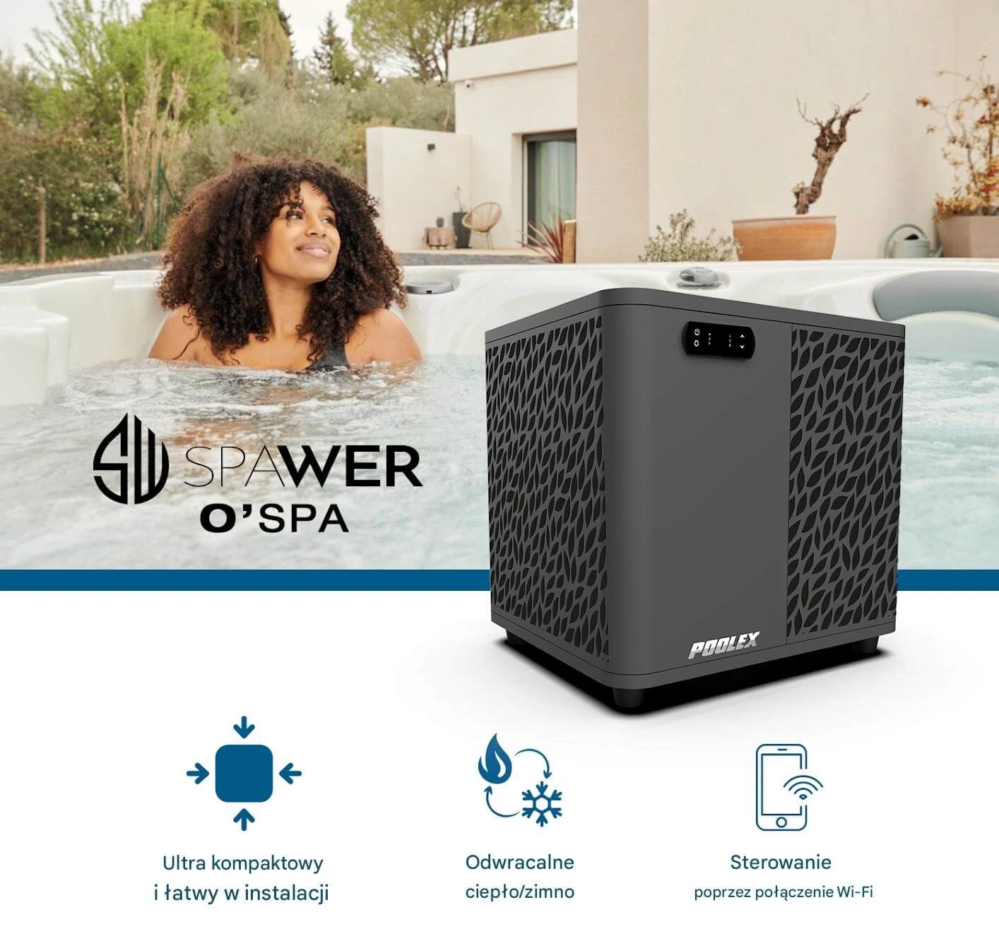 Spawer O'Spa - specjalna pompa ciepła dla małych domowych basenów, ogrodowych spa, wanien, whirpooli i jacuzzi. Dedykowana na chłodniejszego niż zazwyczaj w Polsce klimatu. Umożliwia grzanie lub chłodzenie wody. Wydajny system automatycznego odszraniania, pracuje nawet przy niskich temperaturach. Rekomendujemy wydajność 5kW lub 7kW. Wifi, przyłącza węży 32/38.