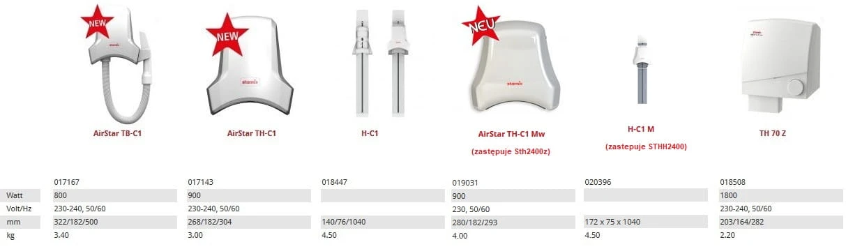 Suszarka basenowa do włosów Starmix Airstar TH-C1M w białej metalowej obudowie grubości 1,2mm, automat i fotokomórka, najnowszy model, zalecamy zakup z prowadnicą (regulatorem wysokości) - razem tworzą nowoczesny zestaw do suszenia włosów na pływalniach, fitness klubach, spa.