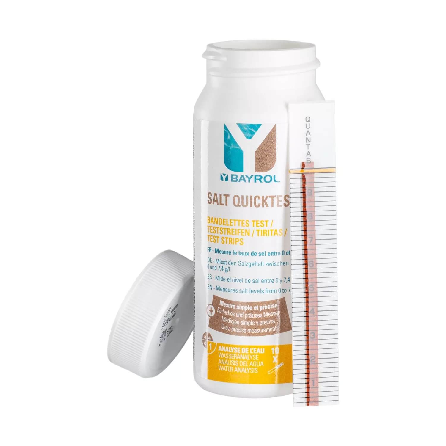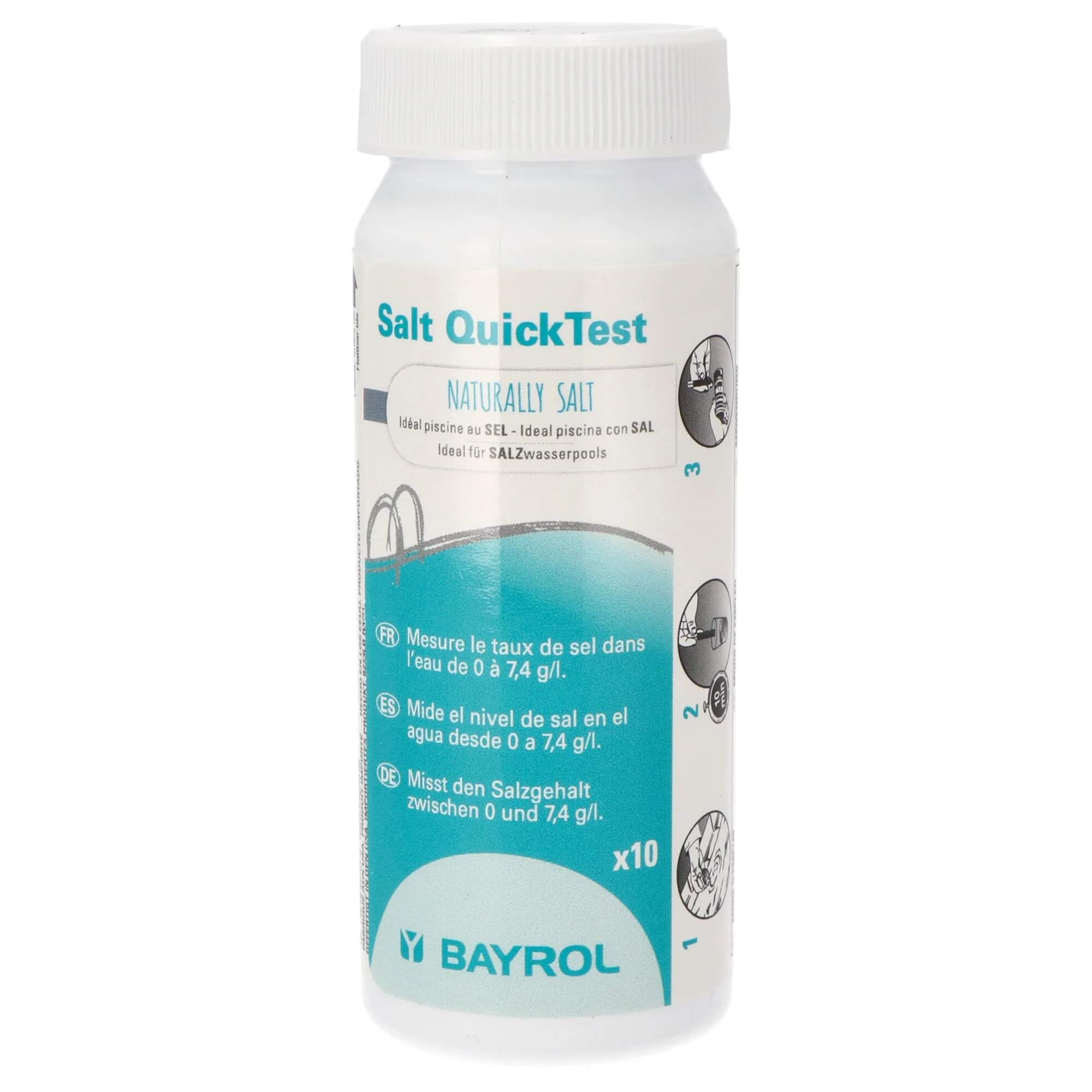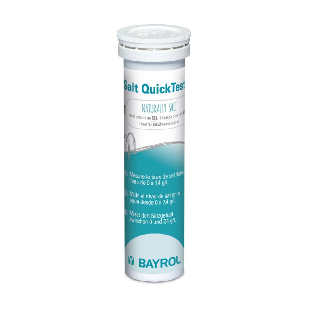 Paski testowe BAYROL Salt QuickTest — puszka z 10 paskami testowymi do określania zawartości soli w basenie — mierzy stężenie soli w zakresie od 0 do 7,4 g/l. Paski testowe BAYROL Salt QuickTest zostały stworzone specjalnie z myślą o użytkownikach basenów wyposażonych w systemy elektrolizy soli. Pozwalają na szybkie i łatwe sprawdzenie stężenia soli w ciągu zaledwie kilku minut, umożliwiając bieżącą kontrolę i precyzyjne dostosowanie poziomu soli, a tym samym zapewnienie optymalnej i skutecznej dezynfekcji wody.