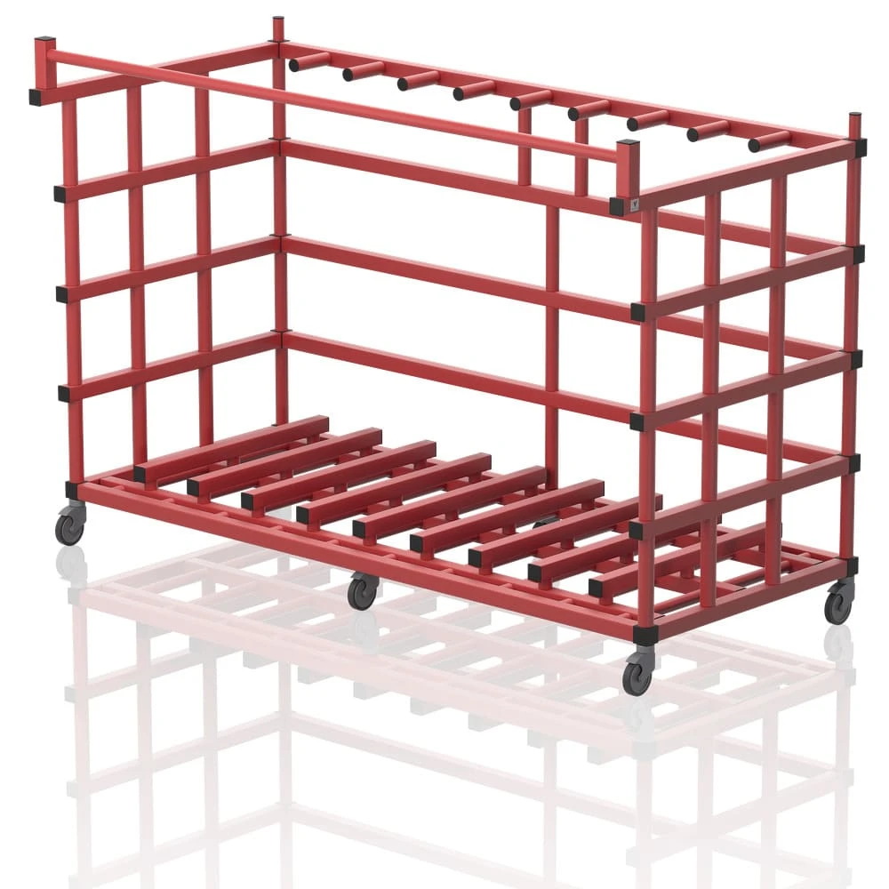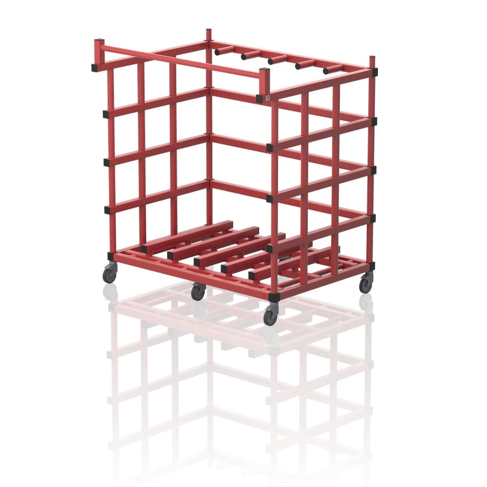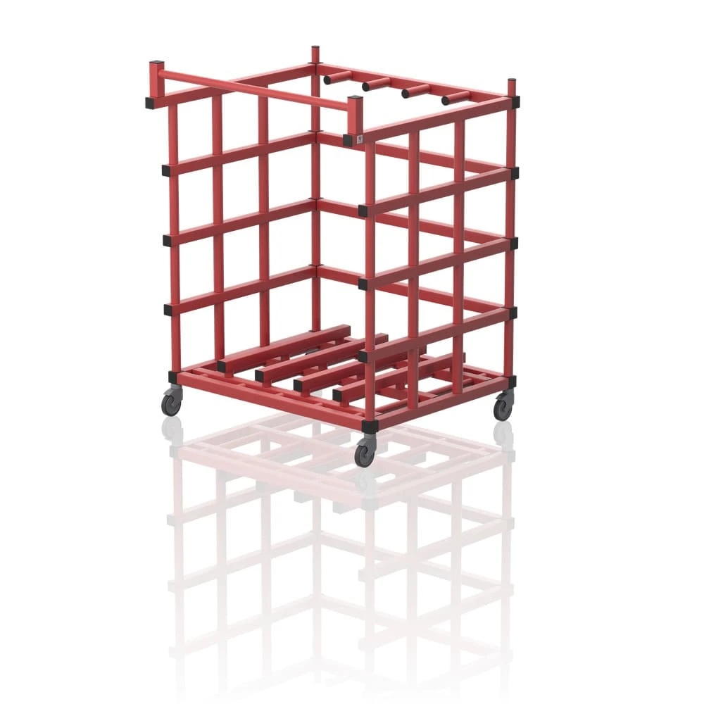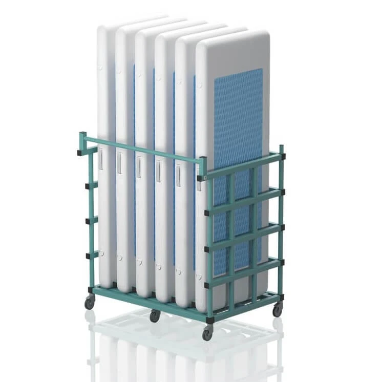 Wózek z wyjmowaną barierką do transportu i przechowywania dziesięciu mat aqua fitness (szerokość 900 mm, grubość 150 lub 200 mm). Wykonany z wytrzymałego, wodoodpornego PVC, idealnego do środowisk o wysokiej wilgotności. Hamowane kółka zapewniają bezpieczną i kontrolowaną mobilność. Dostępny w sześciu kolorach.