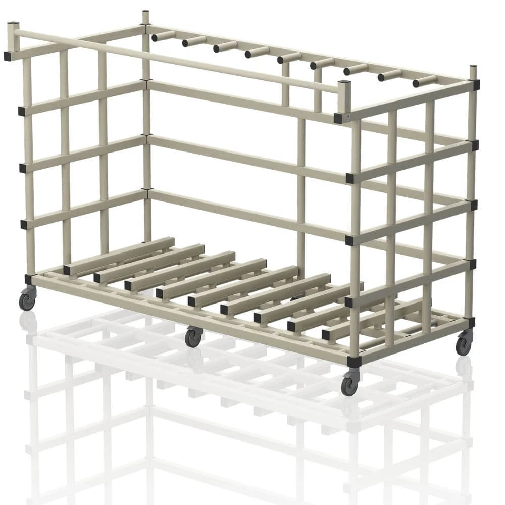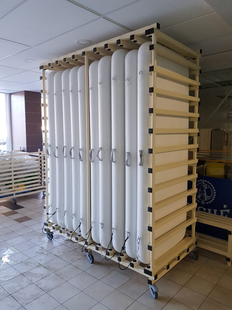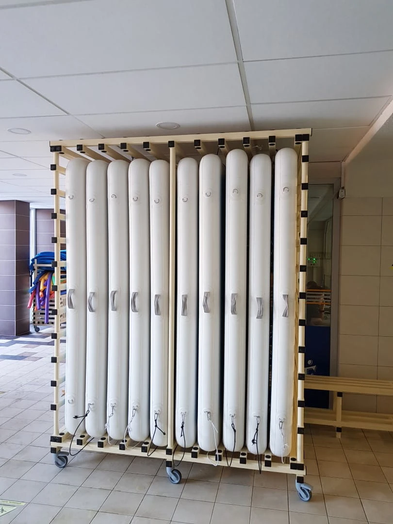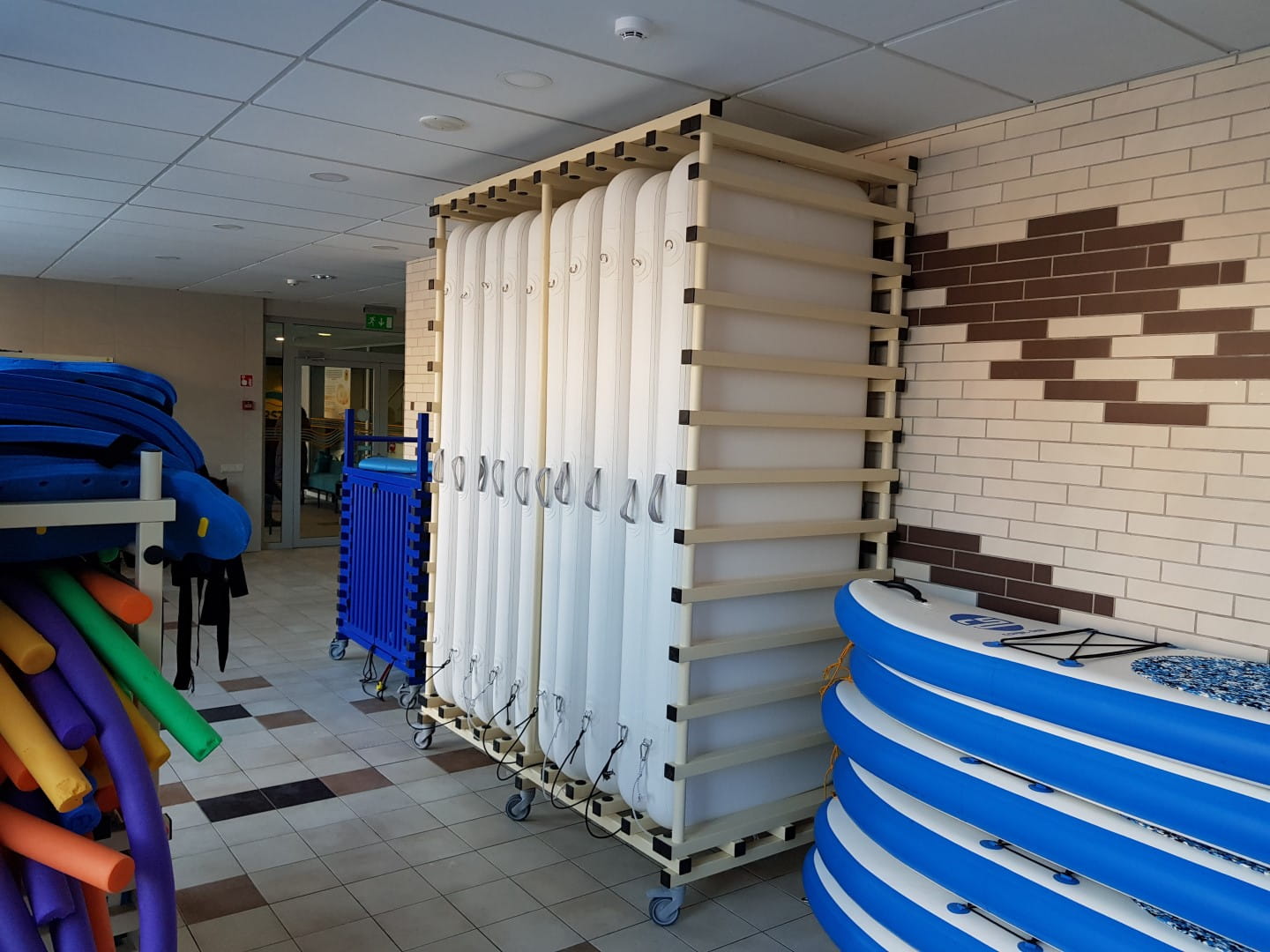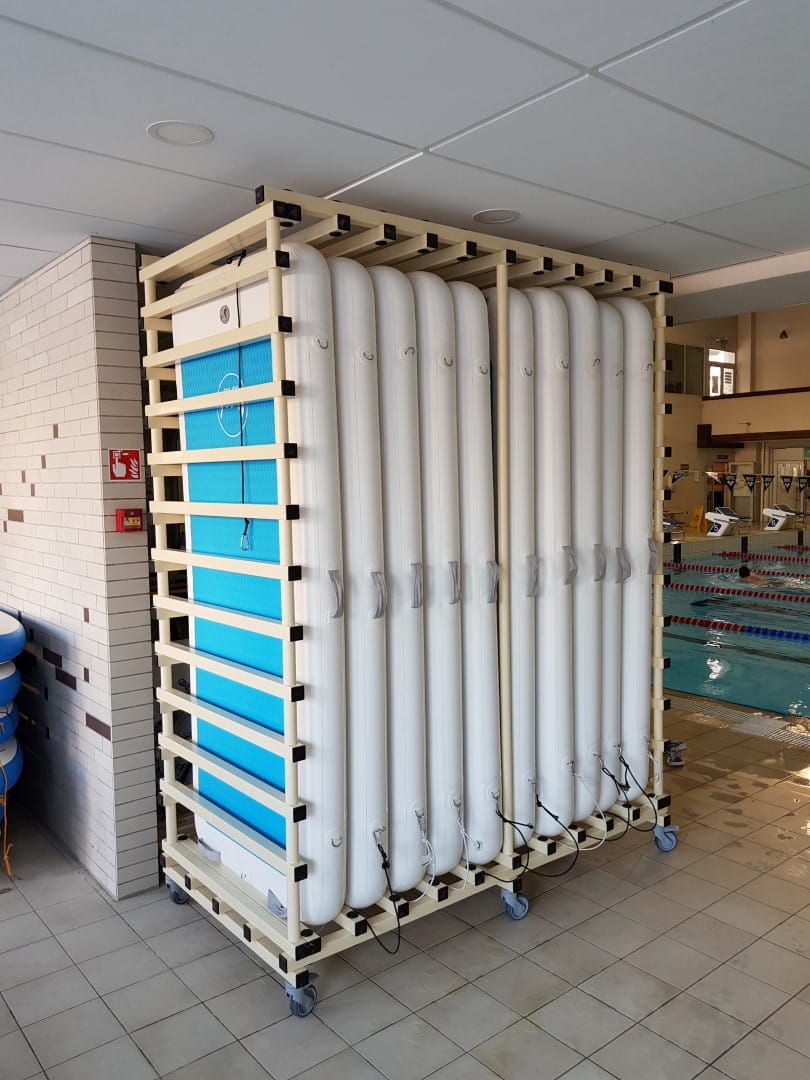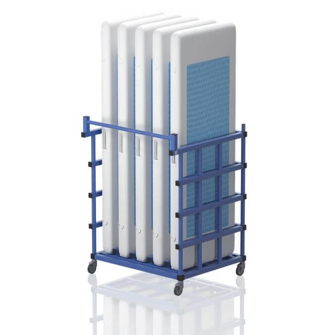 Wózek basenowy na maty i materace, lub do przechowywania różnych pionowych płaskich akcesoriów. Wersje na 5, 6 lub 10 mat/materaców, o grubościach 15 lub 20cm, oraz maksymalnej szerokości 90cm.