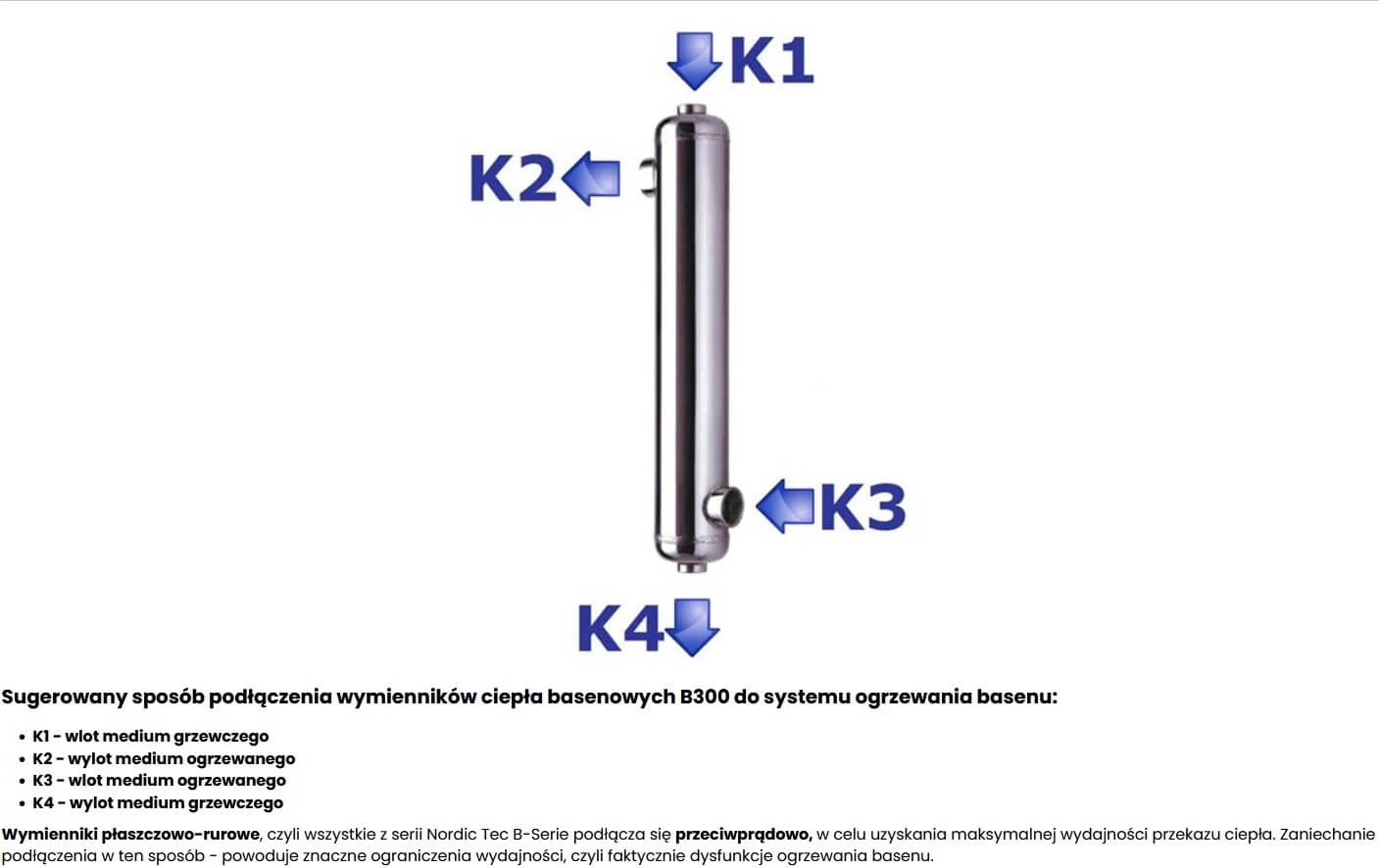 Wymiennik ciepła, wykonany jest ze stali nierdzewnej (bez domieszek). Służy w zakresie podstawowym do łączenia obiegów grzewczych w technice basenowej (ogrzewanie basenów). Jest to podstawowe zastosowanie produktu. Podstawowe zastosowanie to media woda-woda