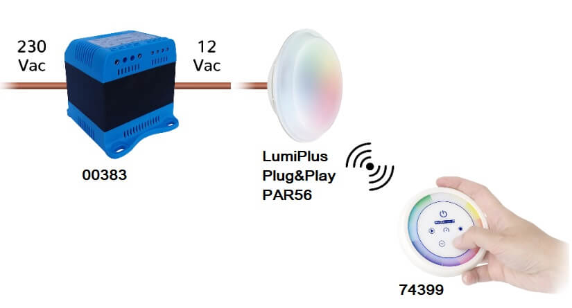 Łatwe w instalacji i łatwe w sterowaniu lampy LumiPlus Plug&Play PAR56 są wyposażone w bardzo intuicyjny system sterowania RGB, który nie wymaga żadnej instalacji w szafce elektrycznej. Ich kompatybilność z projektorami PAR56 sprawia, że są idealnym rozwiązaniem modernizacyjnym. Nie wymaga żadnych prac instalacyjnych w pomieszczeniu technicznym. Konstrukcja urządzenia została zaprojektowana z myślą o całkowicie intuicyjnej obsłudze. Wystarczy 6 przycisków pilota, aby sterować oświetleniem i kolorami całego basenu.
