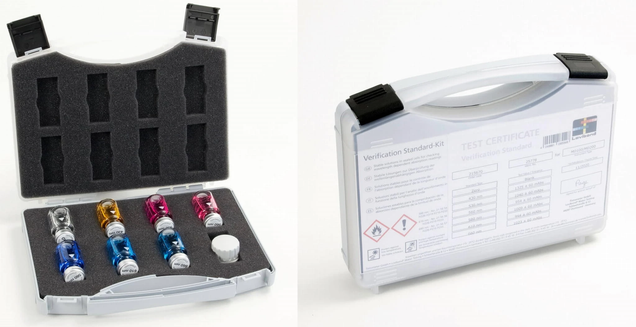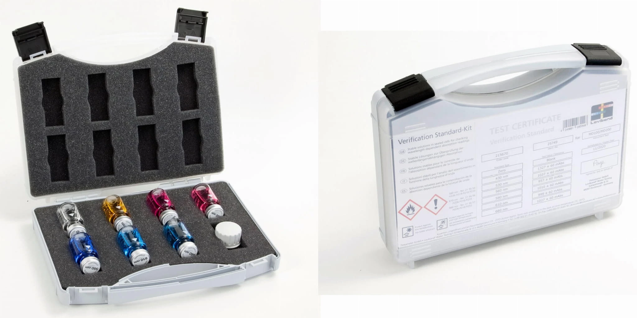 Standardowy zestaw weryfikacyjny dla MD100 / MD200 został zaprojektowany w celu zapewnienia użytkownikowi dokładności i niezawodności wyników związanych ze zintegrowanymi długościami fal. Zestaw zawiera jedną zerówkę standardową, 6 różnych fiolek do sprawdzania 6 różnych długości fal i umożliwia sprawdzenie pełnego zakresu fotometrów MD 100. Okres przechowywania standardowego zestawu weryfikacyjnego wynosi dwa lata od daty produkcji, pod warunkiem, że przechowywanie i użytkowanie jest zgodne z dostarczonymi instrukcjami.